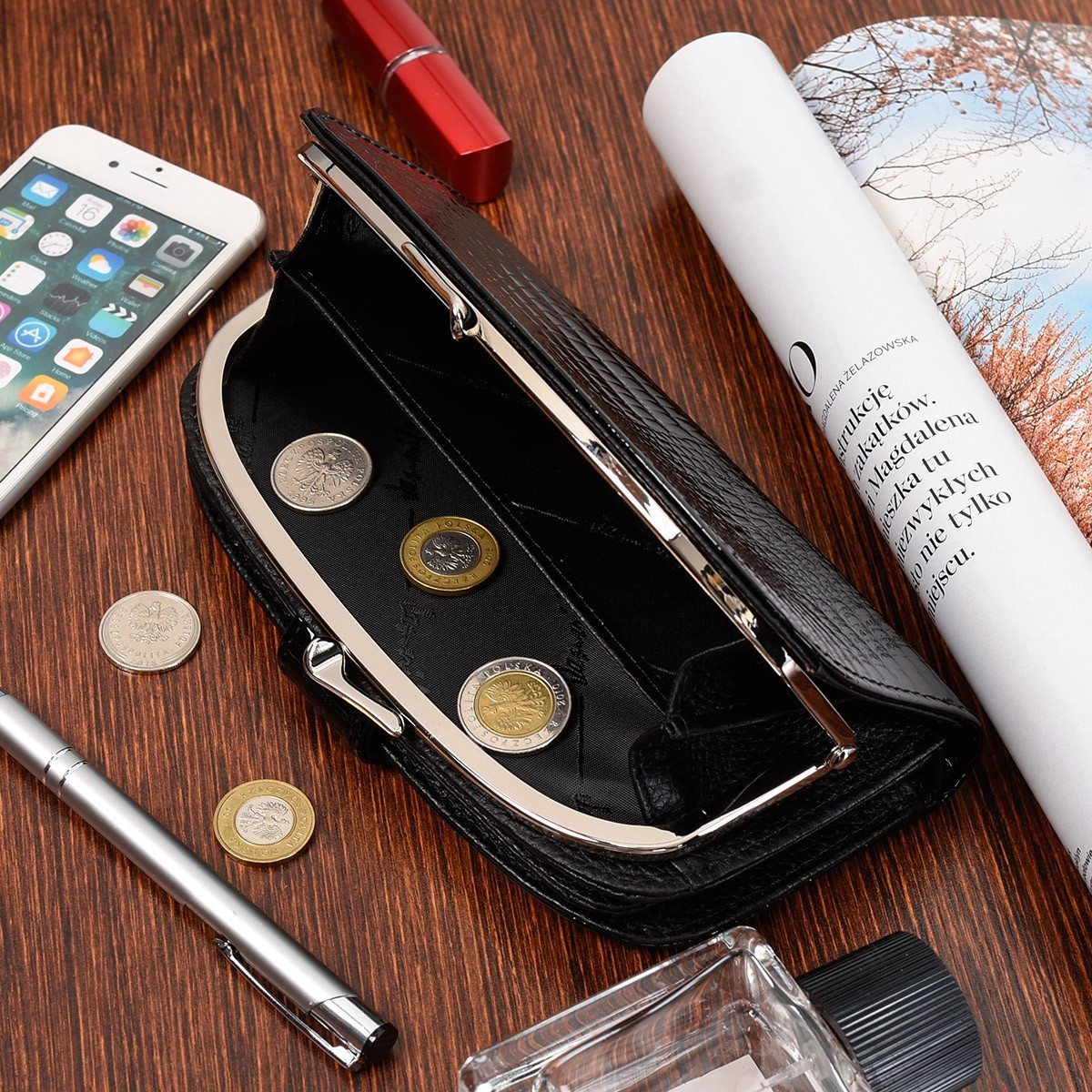 Na zewnątrz portfela znajduje się przegroda na bilon zamykana na specjalny bigiel.
