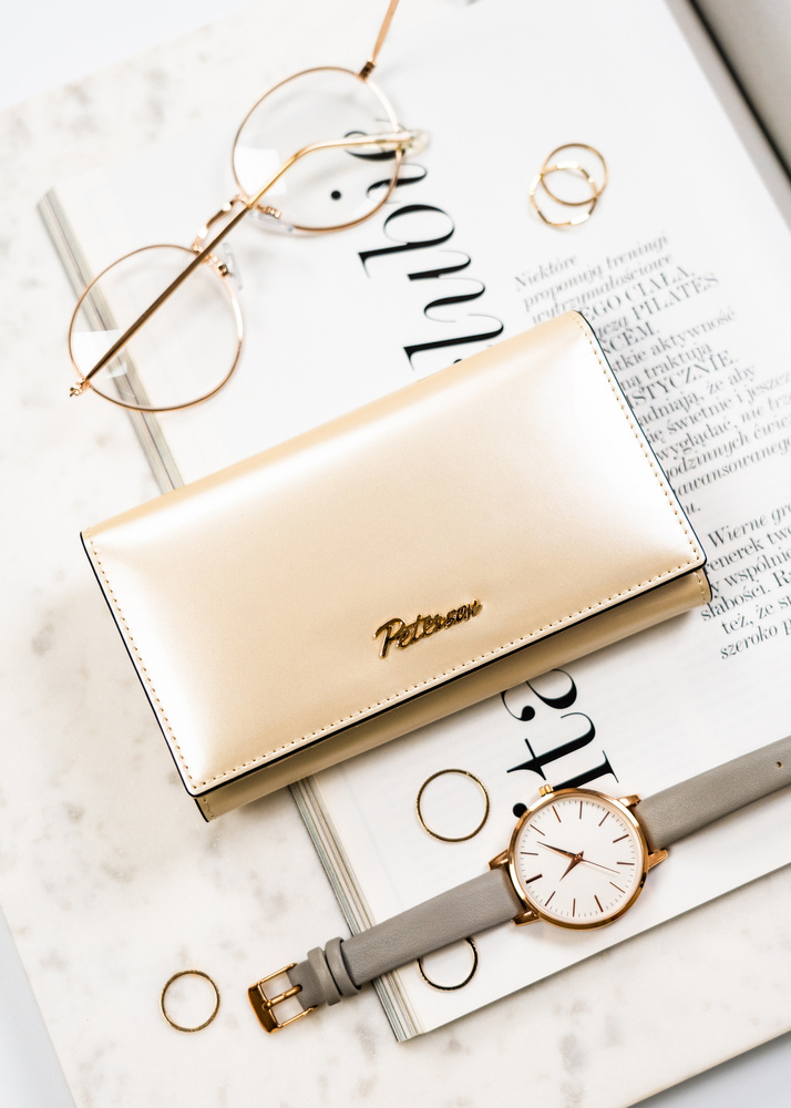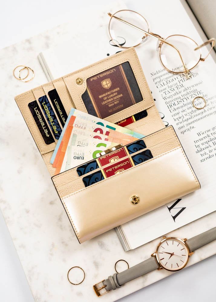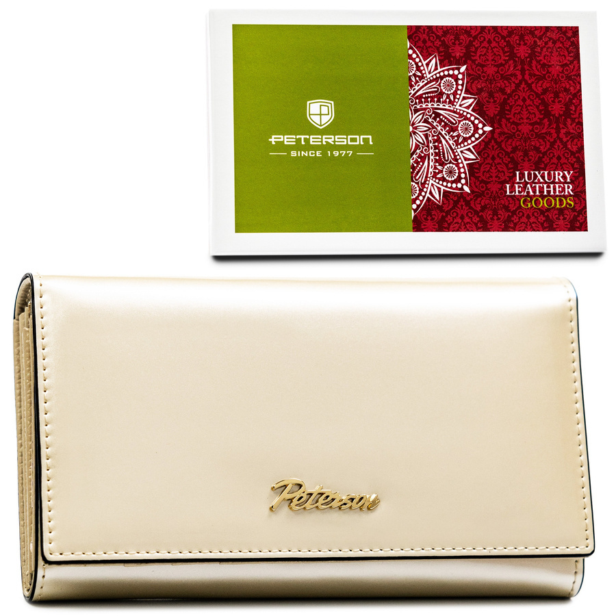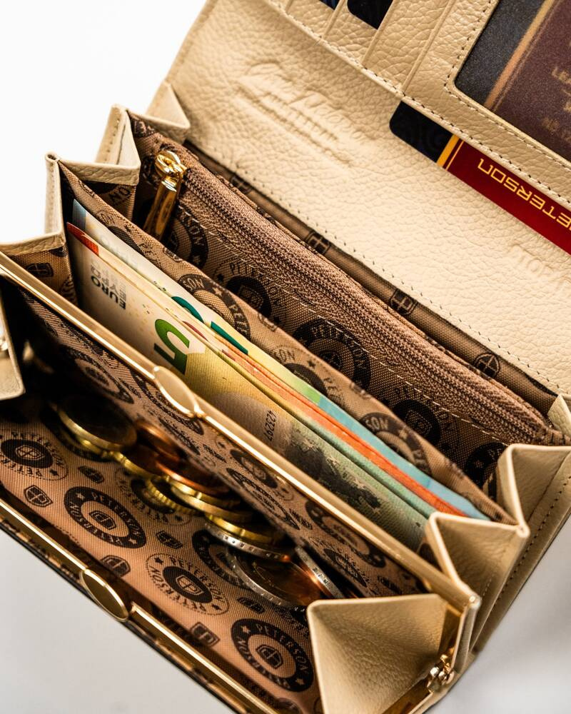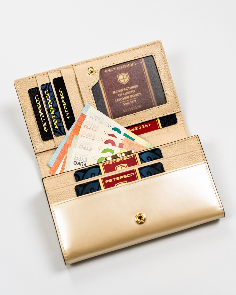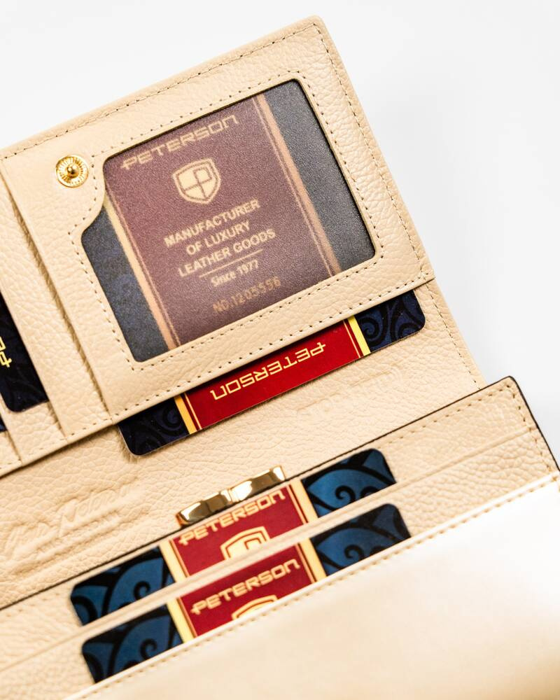 Klasyczny, elegancki portfel damski w beżowym kolorze mieszczący dowód rejestracyjny - PetersonKlasyczny, elegancki portfel damski w beżowym kolorze mieszczący dowód rejestracyjny – Peterson