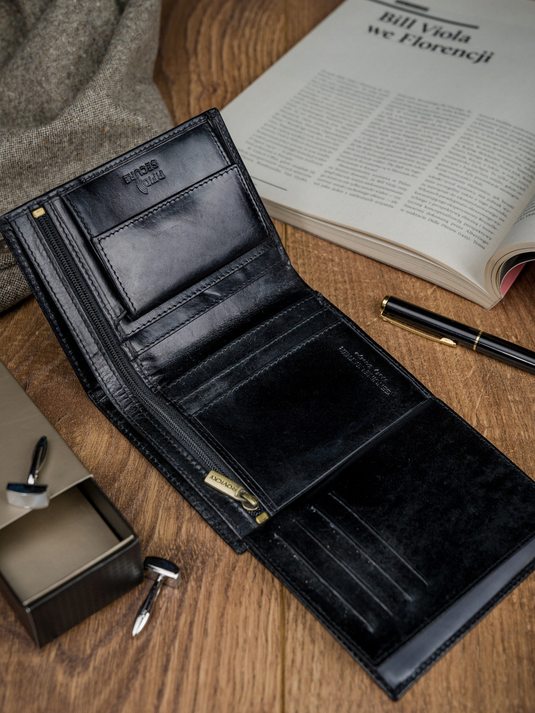 Portfel jest bardzo rozbudowany, jeżeli chodzi o sekcje na dokumenty. Bardzo wygodnym rozwiązaniem jest fakt, że otwiera się on bardzo szeroko. To ułatwi Ci błyskawiczne wyjmowanie dokumentów w każdej chwili!