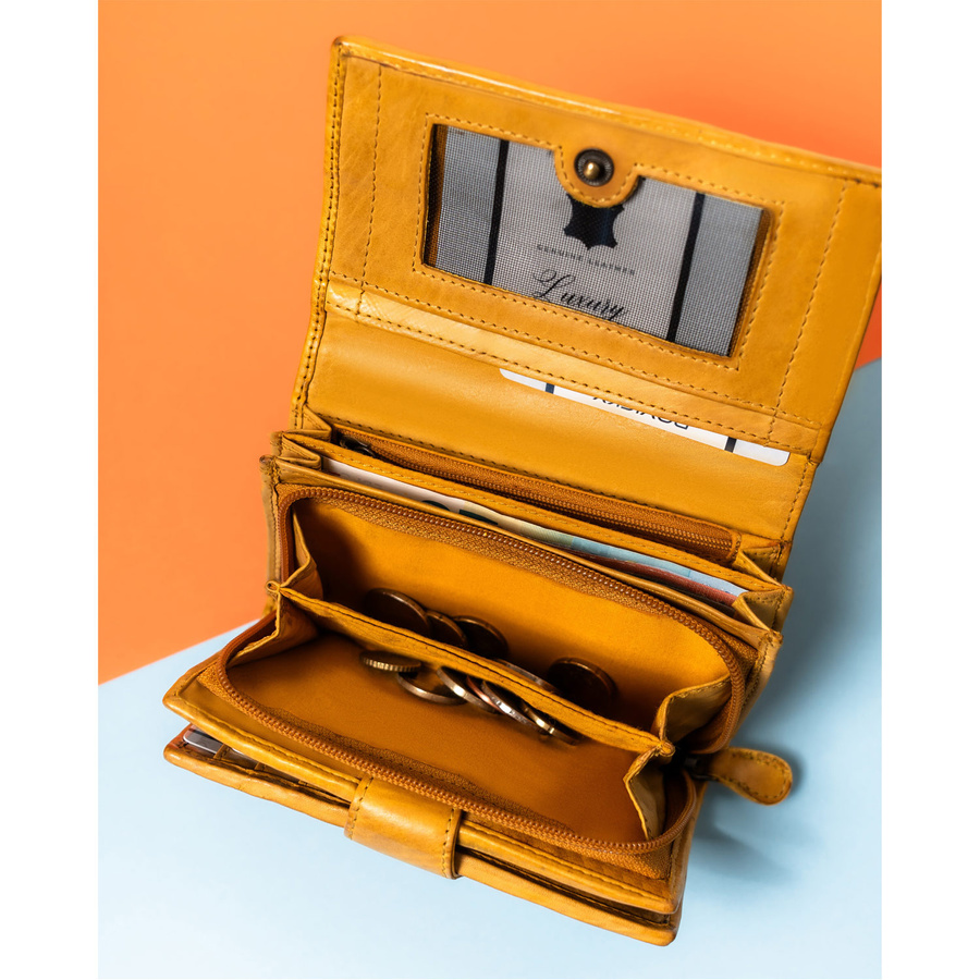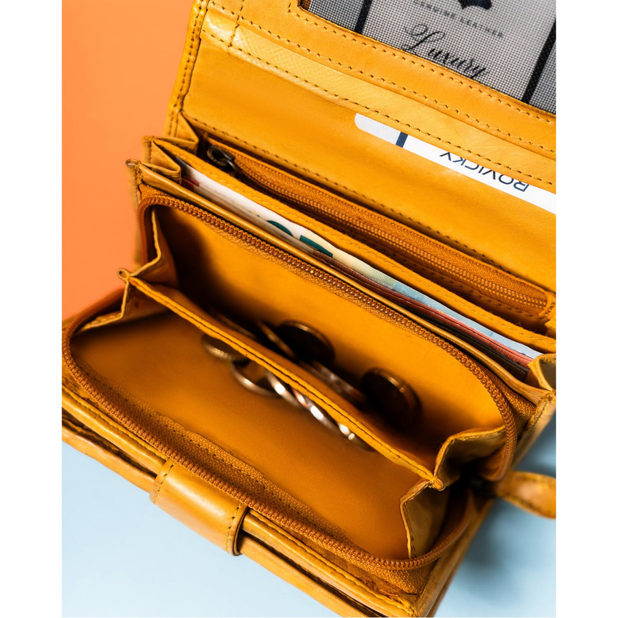 • Podwójna kieszeń na bilon – Przestronne przegrody, zamykane na solidny zamek błyskawiczny, pomieszczą monety w wygodny i bezpieczny sposób.