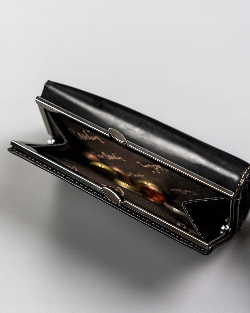 Portfel w orientacji poziomej i zapinany na bigiel oraz zatrzask. Kieszenie na pieniądze również wyściełane są odporną na otarcia podszewką.