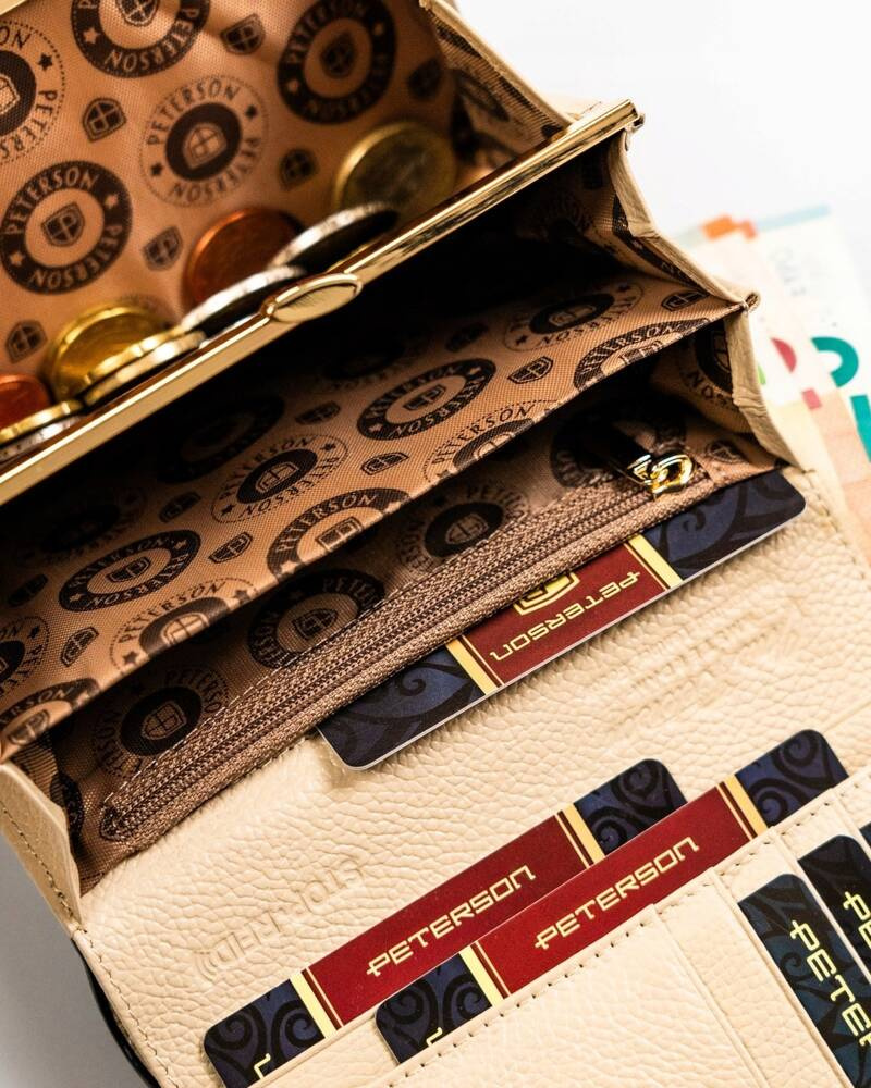 Kieszonki zostały obszyte specjalną podszewką ozdobioną logo marki PETERSON®, która zabezpiecza wnętrze portfela oraz podkreśla jego oryginalność.