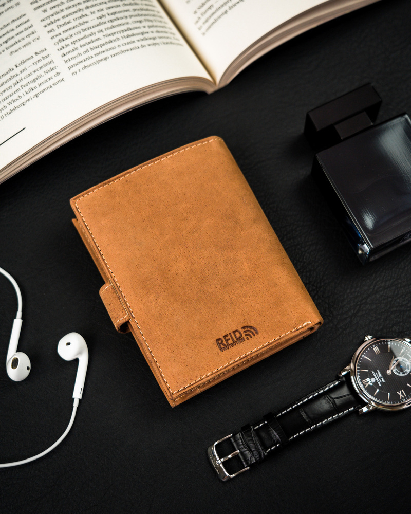 - Ponadczasowy fason dla Panów w każdym wieku | Portfel o klasycznej stylistyce. Model w orientacji pionowej, zapinany na zatrzask.