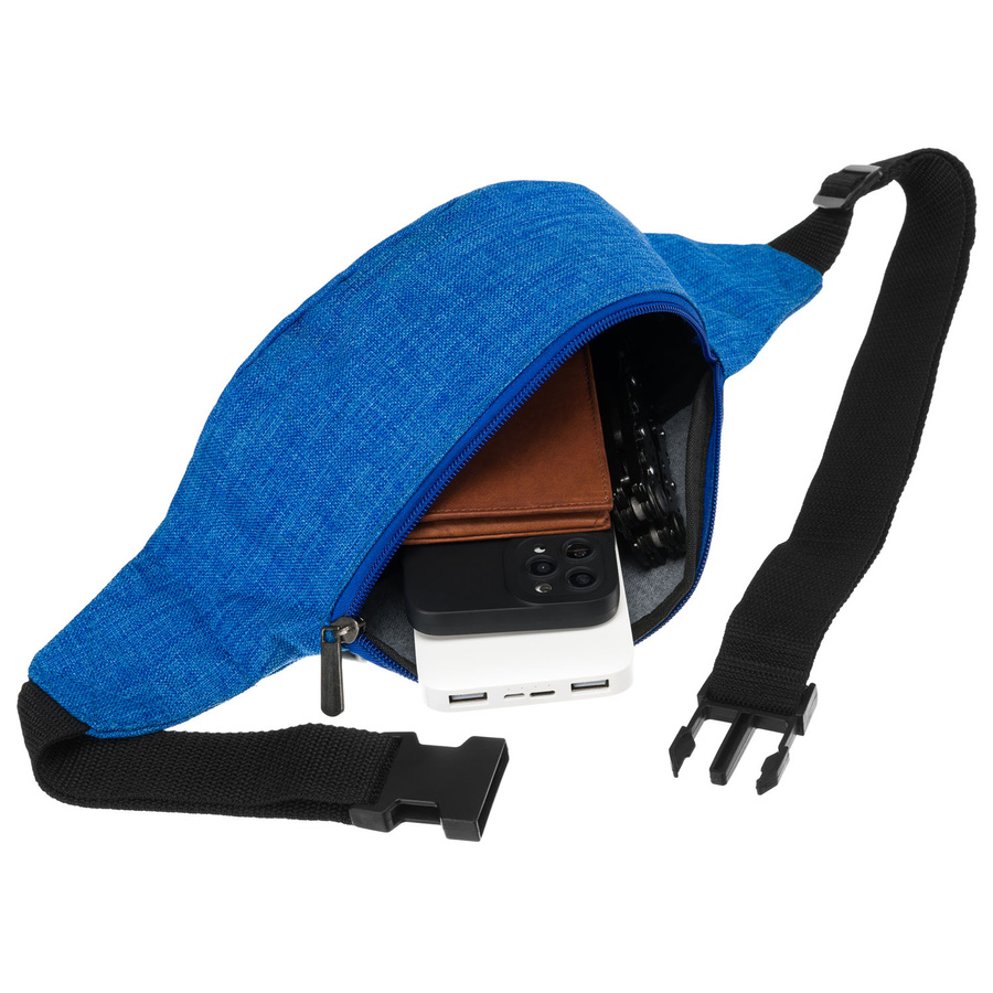 - Regulowany pasek, pozwalający dopasować saszetkę do sylwetki.