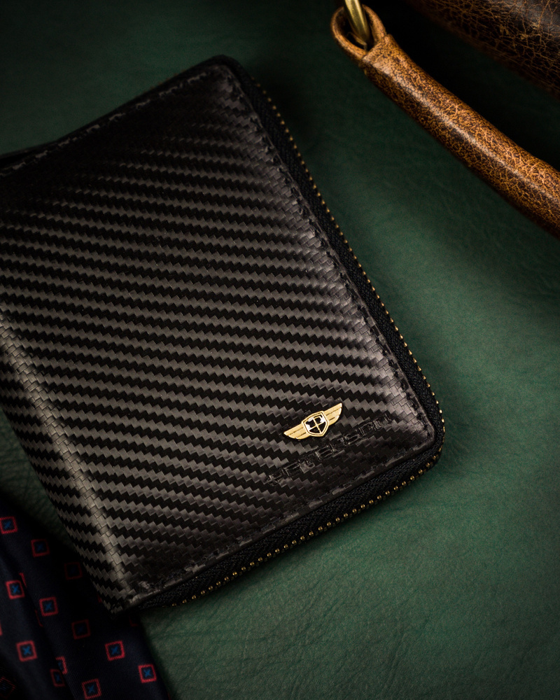 • Najwyższa jakość wykonania | Portfel wykonany został z wysokiej jakości skóry naturalnej powleczonej z zewnątrz warstwą do złudzenia przypominającą włókno węglowe (carbon);