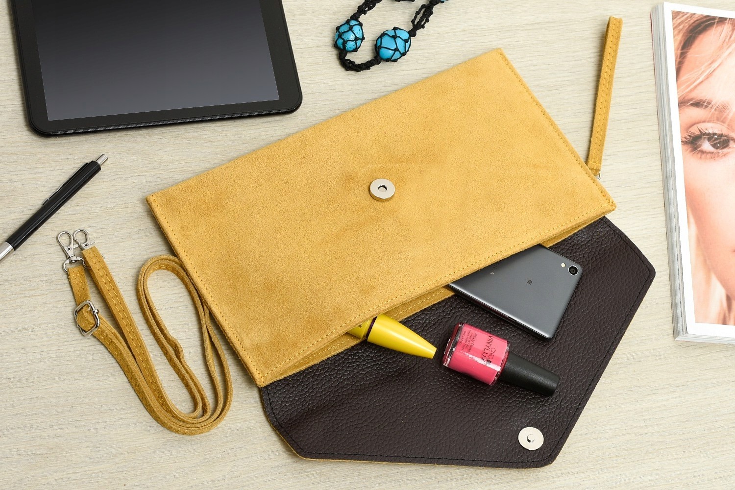 - Pomieści najpotrzebniejsze podręczne rzeczy takie, jak portfel, telefon, dokumenty i drobne kosmetyki