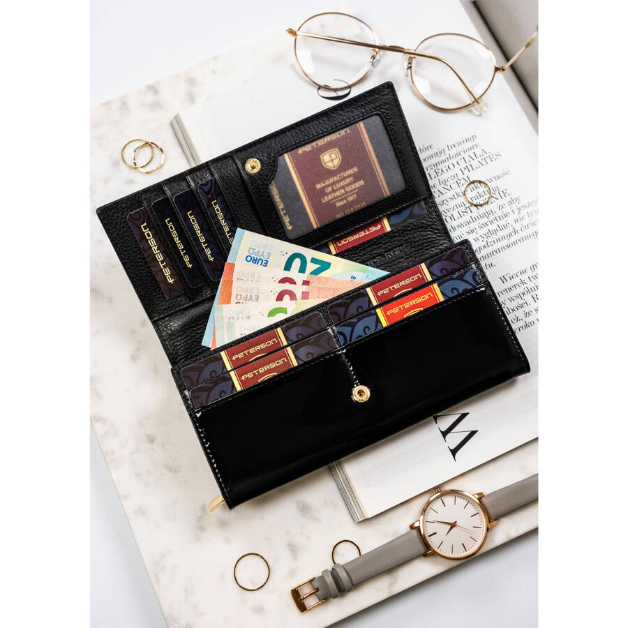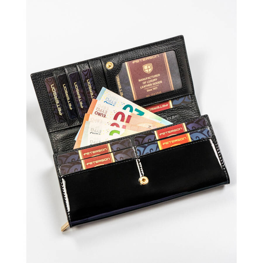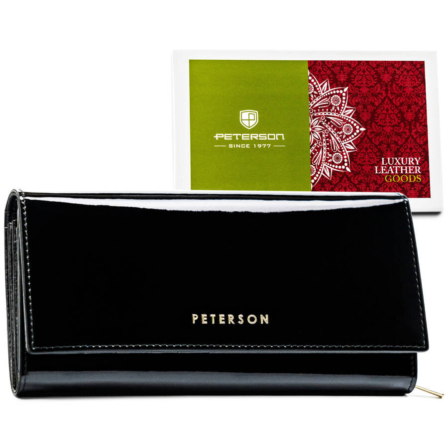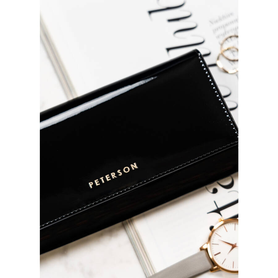 Lakierowany portfel damski ze skóry naturalnej w czarnym kolorze zamykany na zatrzask – Peterson