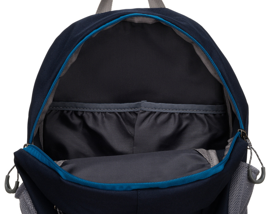 Plecak posiada jedną dużą komorę, w której pomieścisz najpotrzebniejsze rzeczy – od przekąsek, przez mapy, aż po odzież na zmianę. Ponadto, do dyspozycji masz cztery dodatkowe kieszenie i przegrody, które ułatwią organizację i szybki dostęp do podręcznych przedmiotów. Siatkowe kieszenie boczne świetnie sprawdzą się do przechowywania butelek z wodą lub drobnych akcesoriów, a elastyczna linka z przodu plecaka pozwala na przypięcie dodatkowego sprzętu turystycznego, takiego jak kijki trekkingowe.