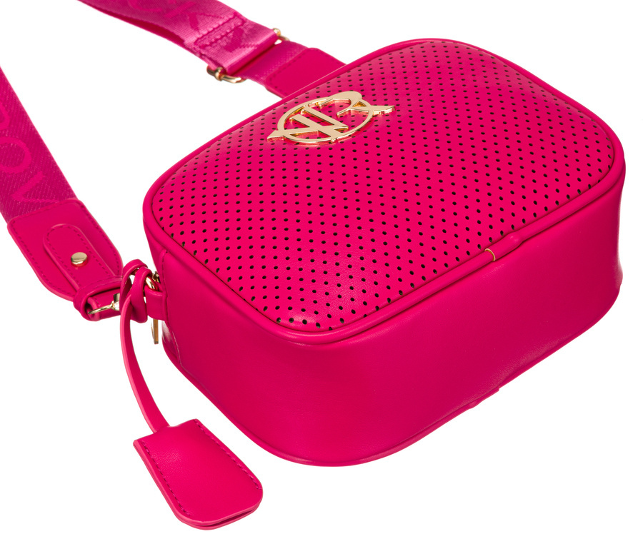 - Model o stylowym wykończeniu | Torebka z ażurowym panelem przednim. Front zdobi duże, biżuteryjne logo marki;