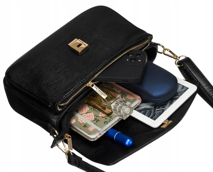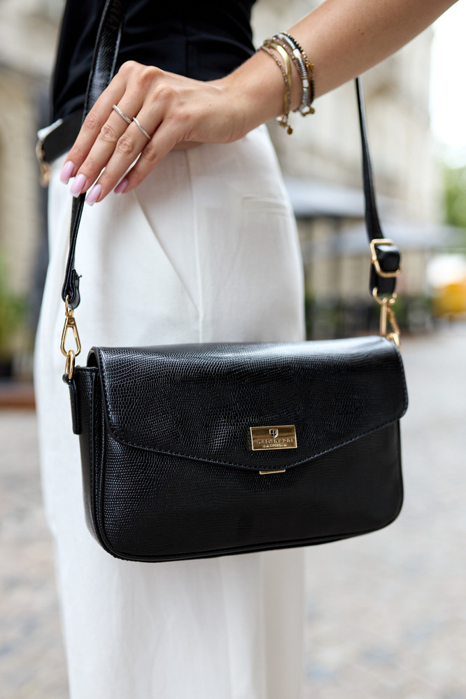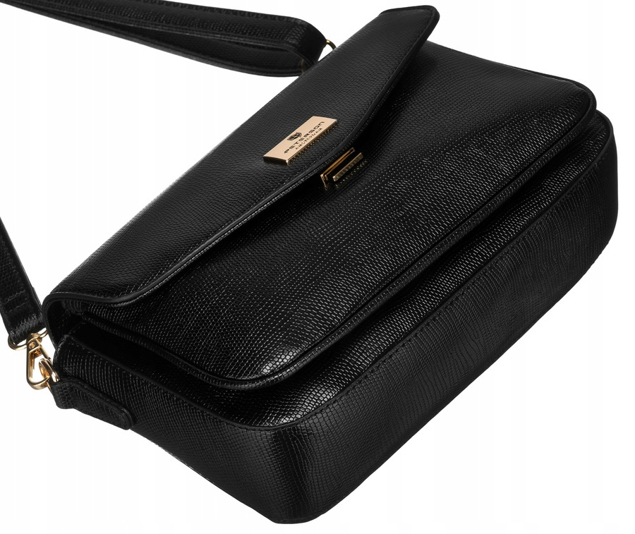 - Klasyczny design | Torebka zamykana klapką na zatrzask. Wszystkie okucia w torebce mają piękny złoty kolor;