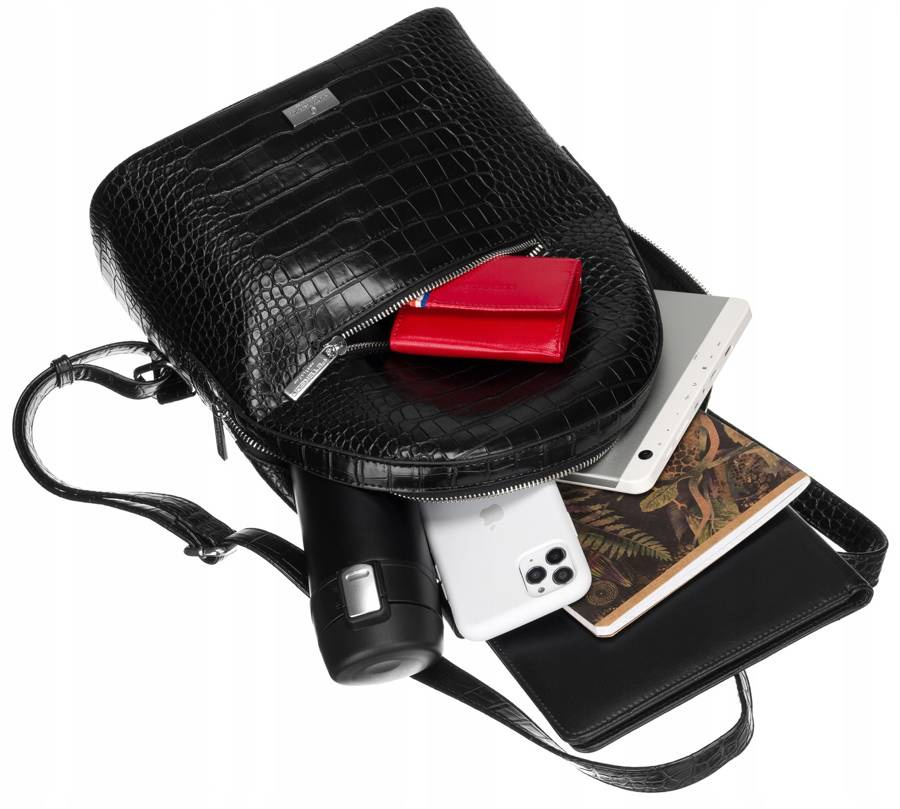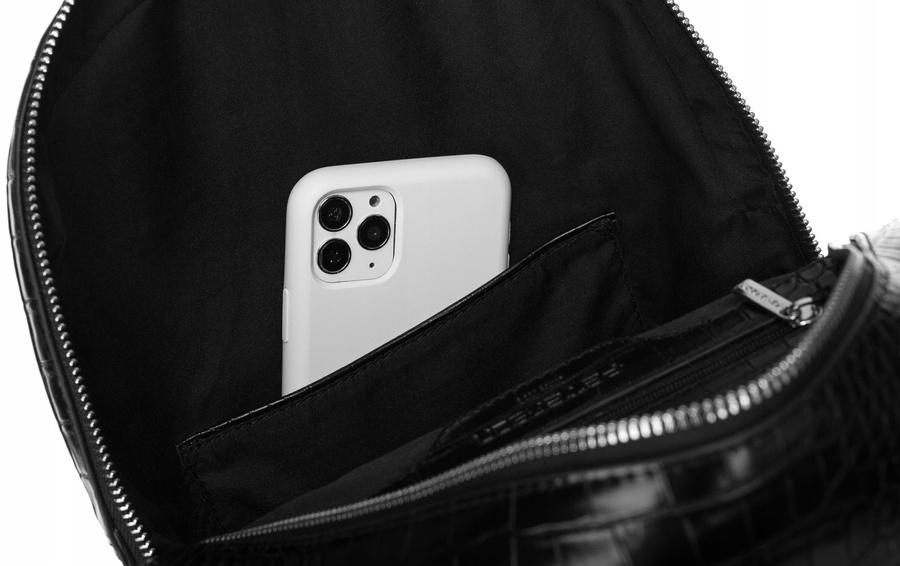 Prezentowany model wykonany został bardzo trwale z wysokiej klasy skóry ekologicznej z pięknym tłoczeniem imitującym skórę krokodyla. Zawieszony na regulowanych szelkach z eko skóry. Posiada uchwyt na dłoń, który będzie przydatny np. w komunikacji miejskiej. Wszystkie jego metalowe elementy mają srebrny kolor.