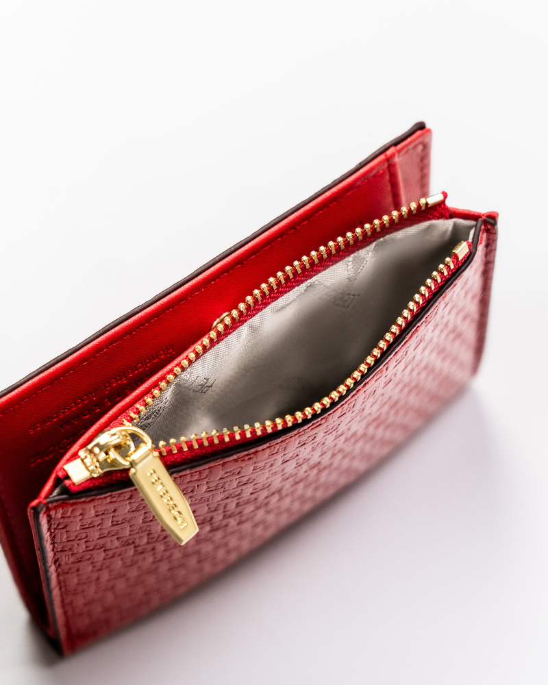 Portfel odszyty bardzo trwale z doskonałej jakości skóry ekologicznej. Surowiec jest bardzo przyjemny w dotyku i do złudzenia przypomina naturalną skórę bydlęcą. Model stosunkowo niewielkich rozmiarów – idealny do małych torebek. Ponadczasowy fason dopełniony złotymi okuciami. Model w orientacji poziomej, zamykany na zatrzask. Front ozdobiony złotym logo marki.