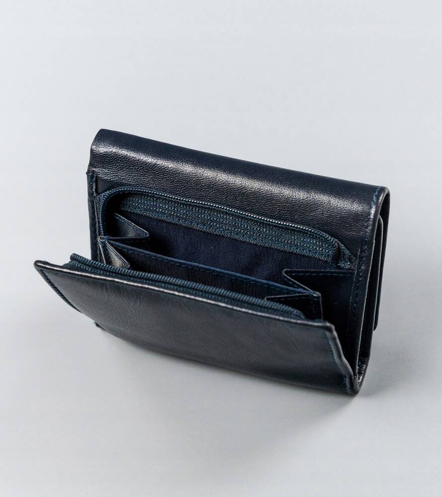 Portfel w orientacji poziomej zapinany na nap. Kieszenie na pieniądze, również wyściełane są odporną na otarcia podszewką.