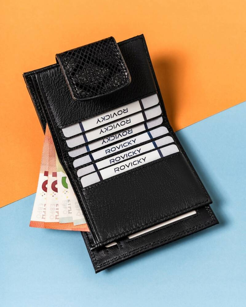 - 13 miejsc na karty płatnicze, wizytówki i dokumenty o standardowym formacie. Jedna z przegródek jest przezroczysta i świetnie nada się na fotografię.