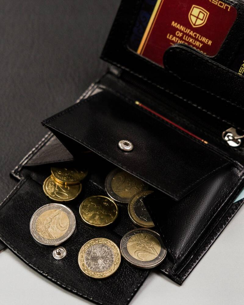 - 1 obszerną kieszeń na bilon, zamykaną na zatrzask. Dzięki odpowiednio przemyślanym wymiarom, wyciąganie z niej pieniędzy jest wygodne i komfortowe.