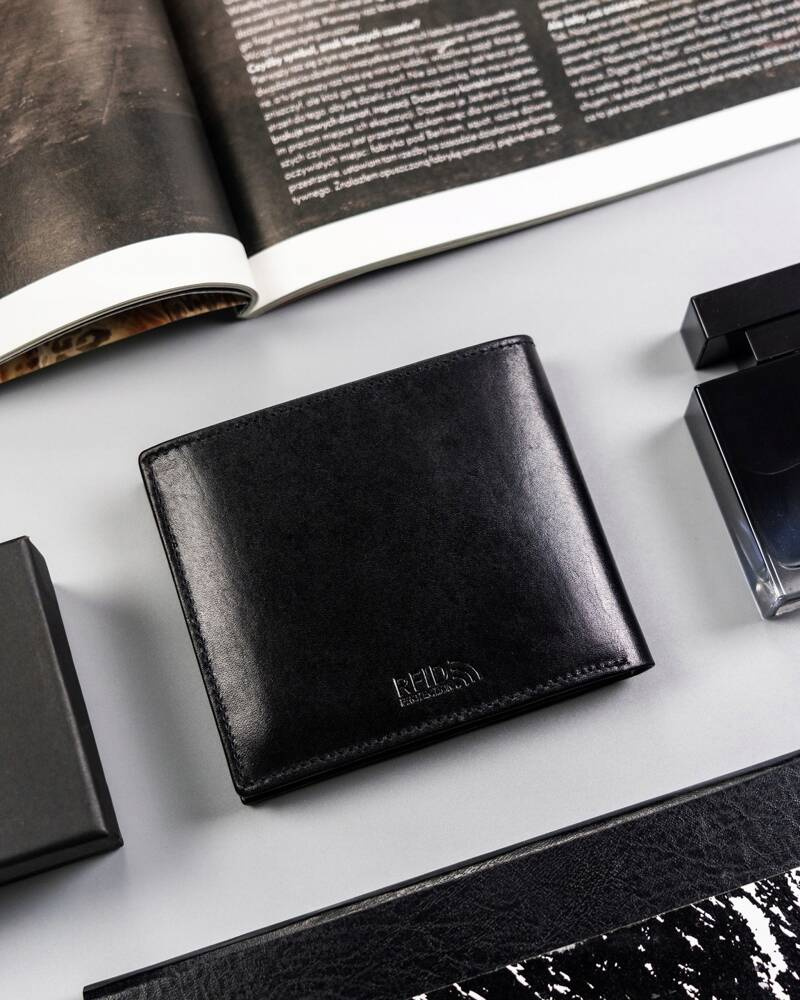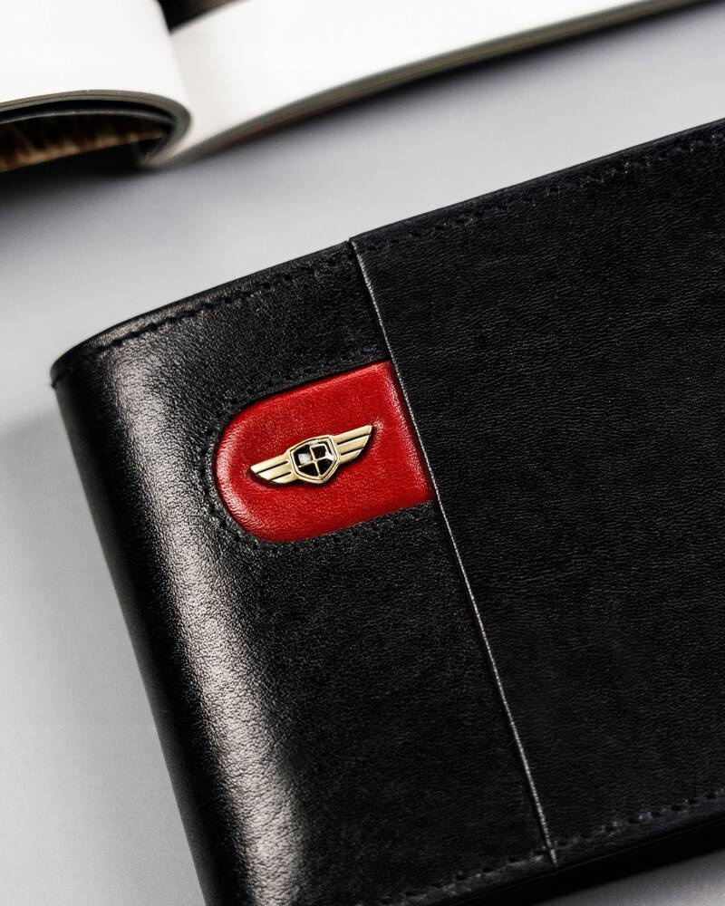 - Skóra najwyższej jakości | Odszyty bardzo trwale z doskonałej jakości gładkiej skóry naturalnej w czarnym kolorze, dodatkowo na froncie portfela umieszczono skrzydlate logo marki na czerwonej wstawce;