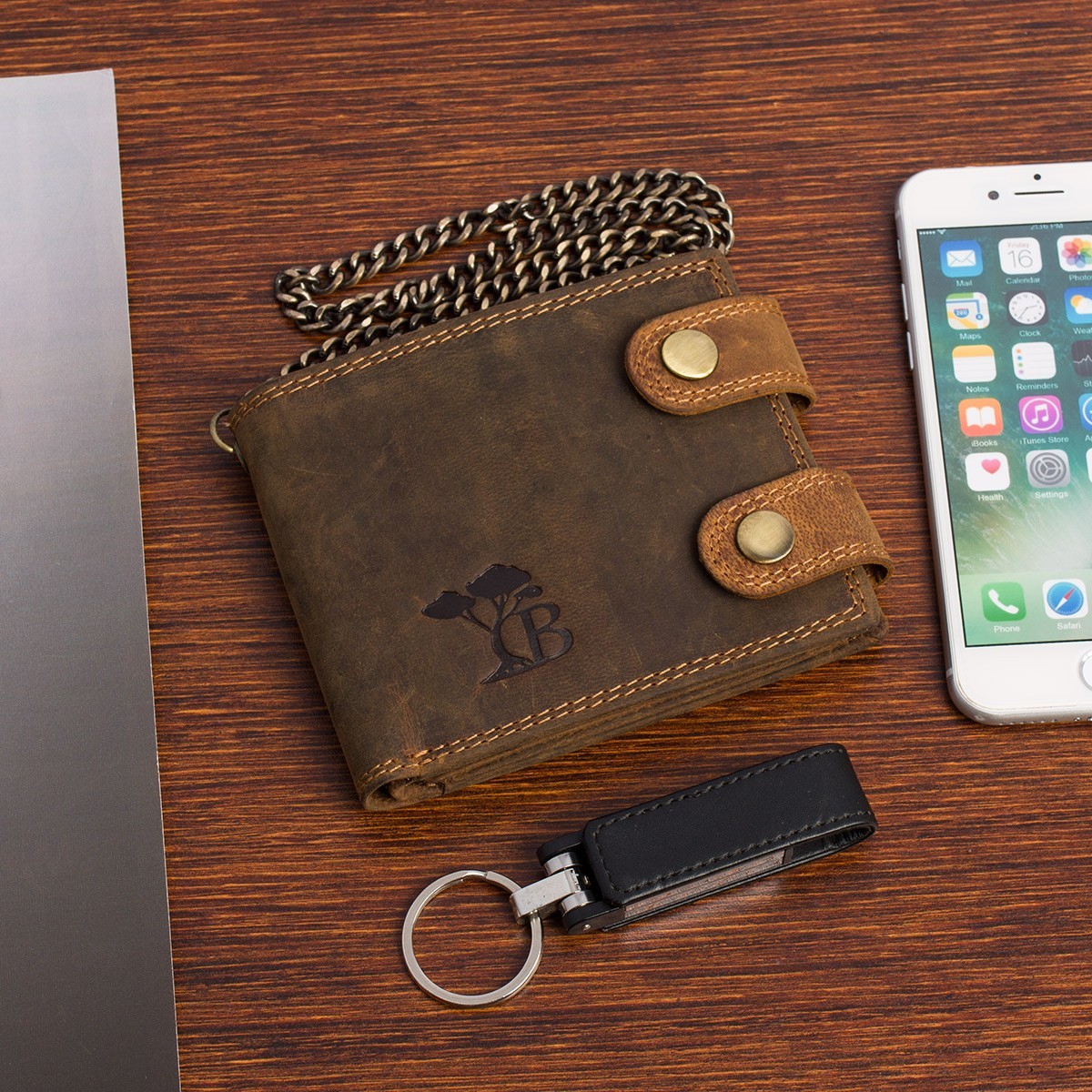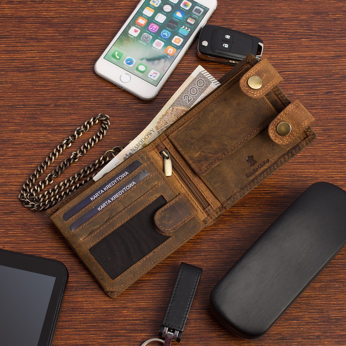 Męski portfel skórzany brązowy nubuk skóra z łańcuchem poziomy Beltimore R80