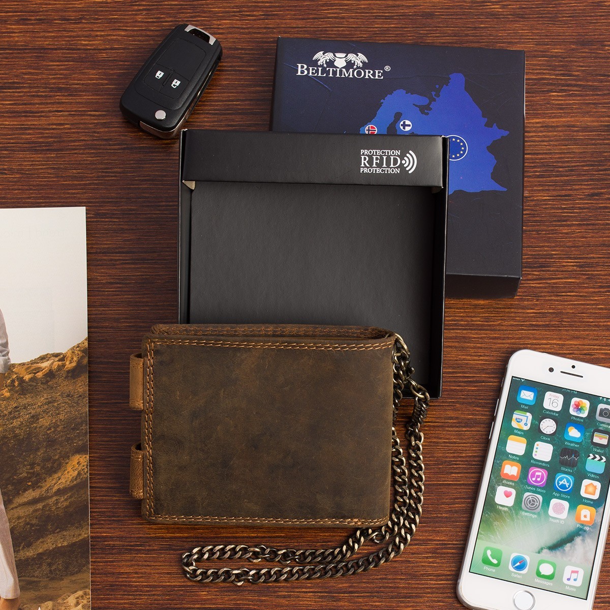 Stylowy, lekki, solidny, skórzany, męski portfel w stylu vintage z łańcuchem, mieszczący dowód rejestracyjny pojazdu, polskiej marki Beltimore w wersji poziomej ®