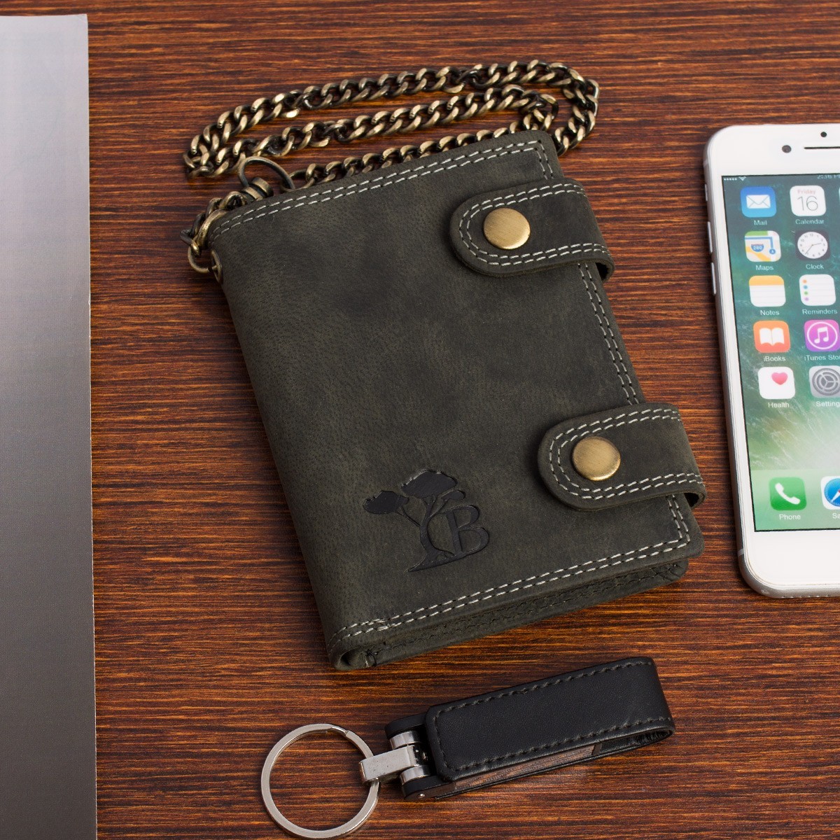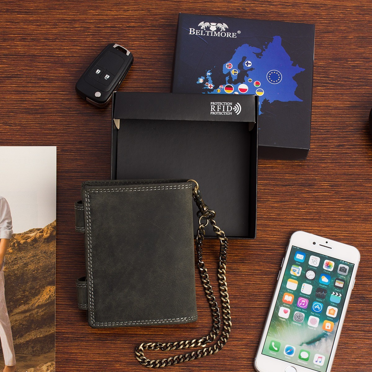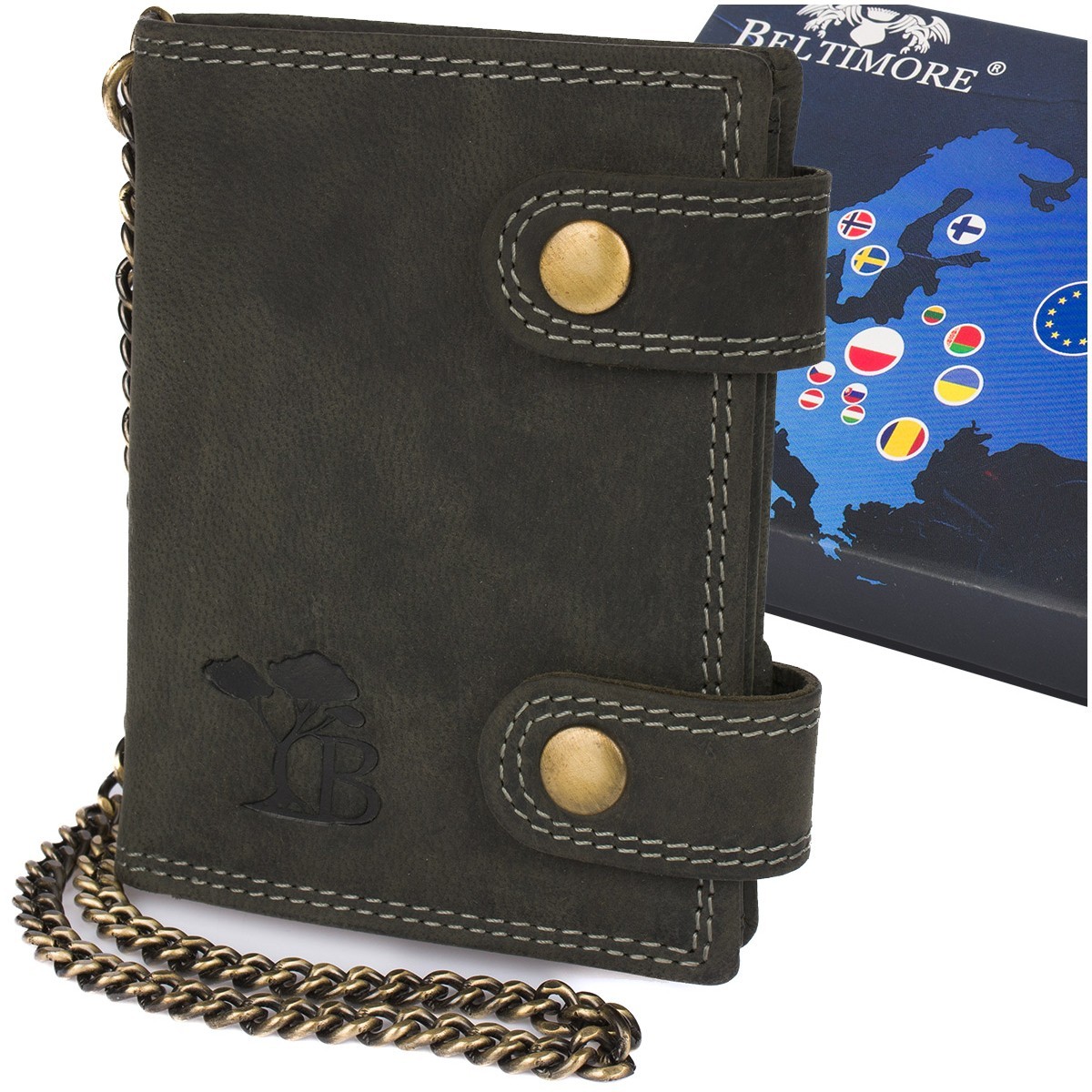 Stylowy, lekki, solidny, skórzany, męski portfel w stylu vintage z łańcuchem, mieszczący dowód rejestracyjny pojazdu, polskiej marki Beltimore®
