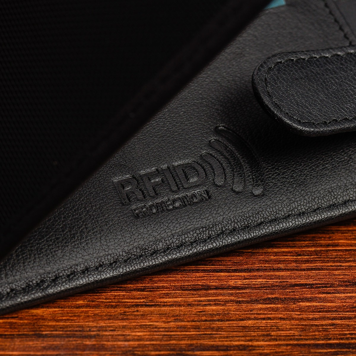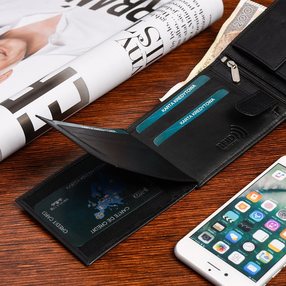 - Portfel posiada specjalne zabezpieczenie RFiD, które chroni dane na kartach przed nieautoryzowanym, zbliżeniowym odczytem, mogącym doprowadzić do kradzieży środków z kart kredytowych, debetowych, ID czy paszportu