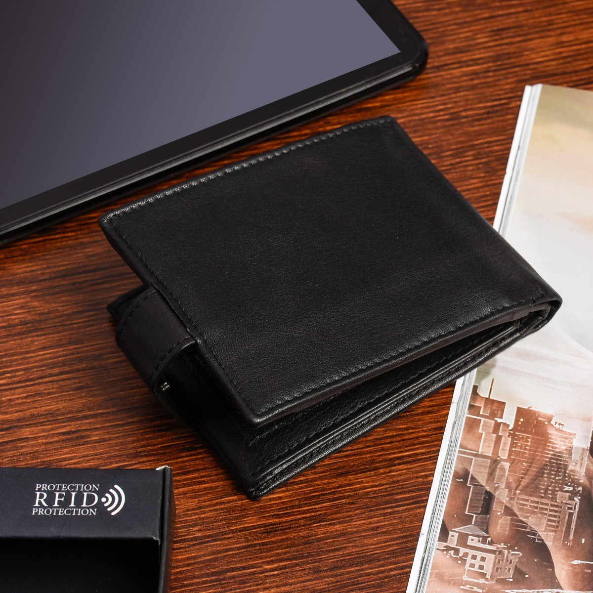 Męski portfel skórzany z ochroną kart zbliżeniowych RFID i nowoczesnym pudełkiem.