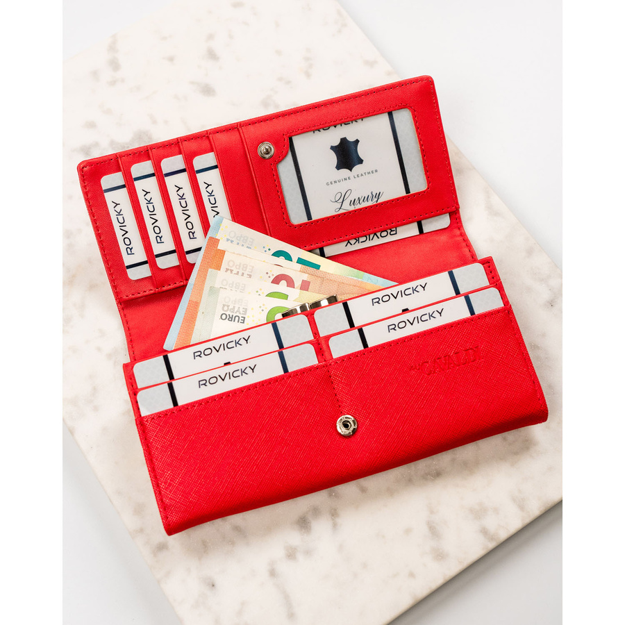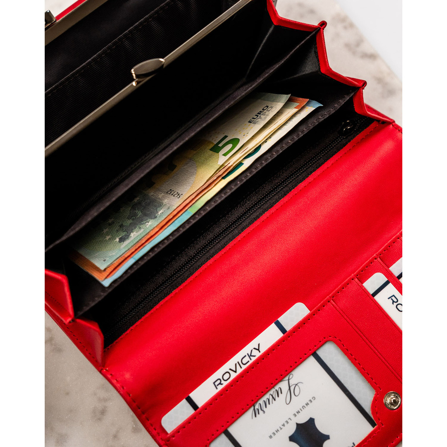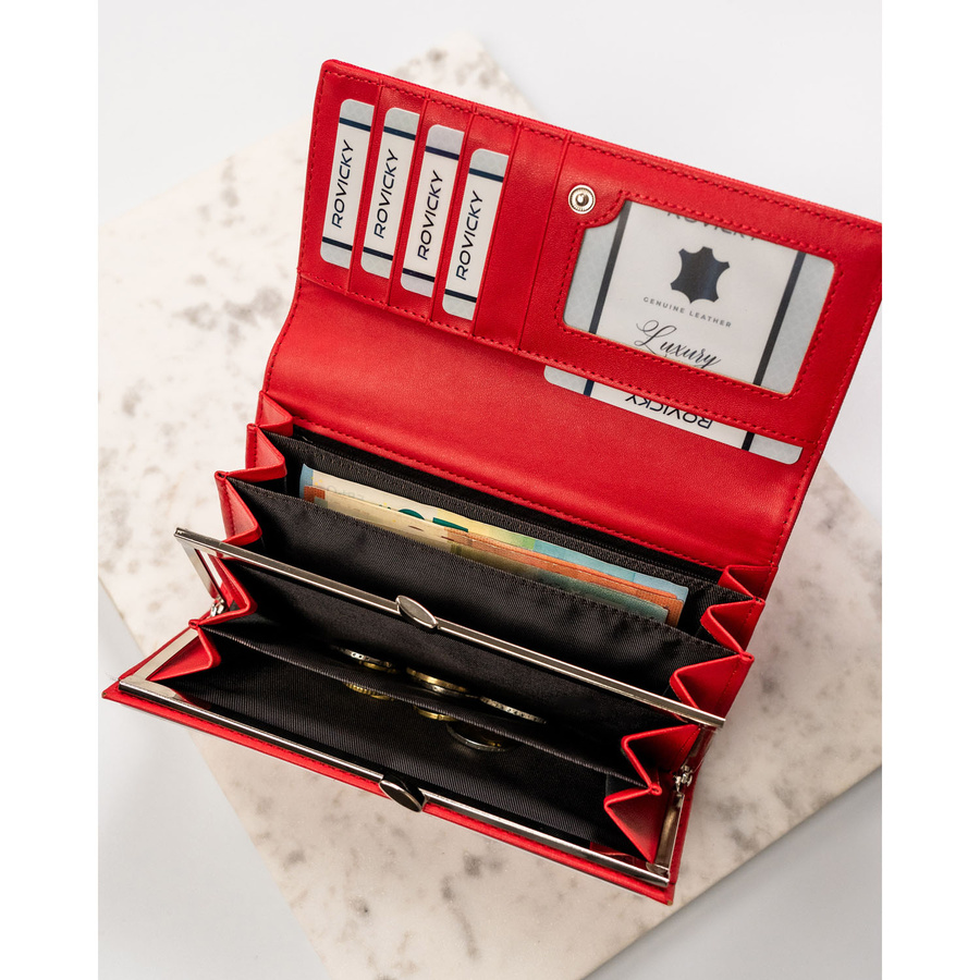 - Pojemna kieszeń na monety oraz trzy przegrody na banknoty;