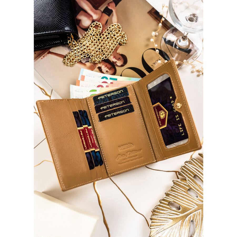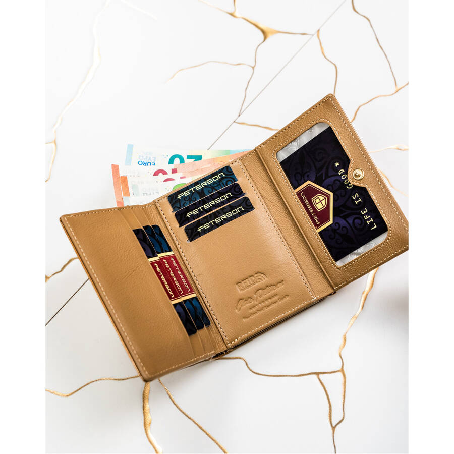 Na froncie znajduje się złote logo marki Peterson®, harmonizujące z całością kolorystyczną portfela. Prosty, klasyczny design oraz perfekcyjnie wykończone krawędzie tworzą spójny, ekskluzywny wygląd.