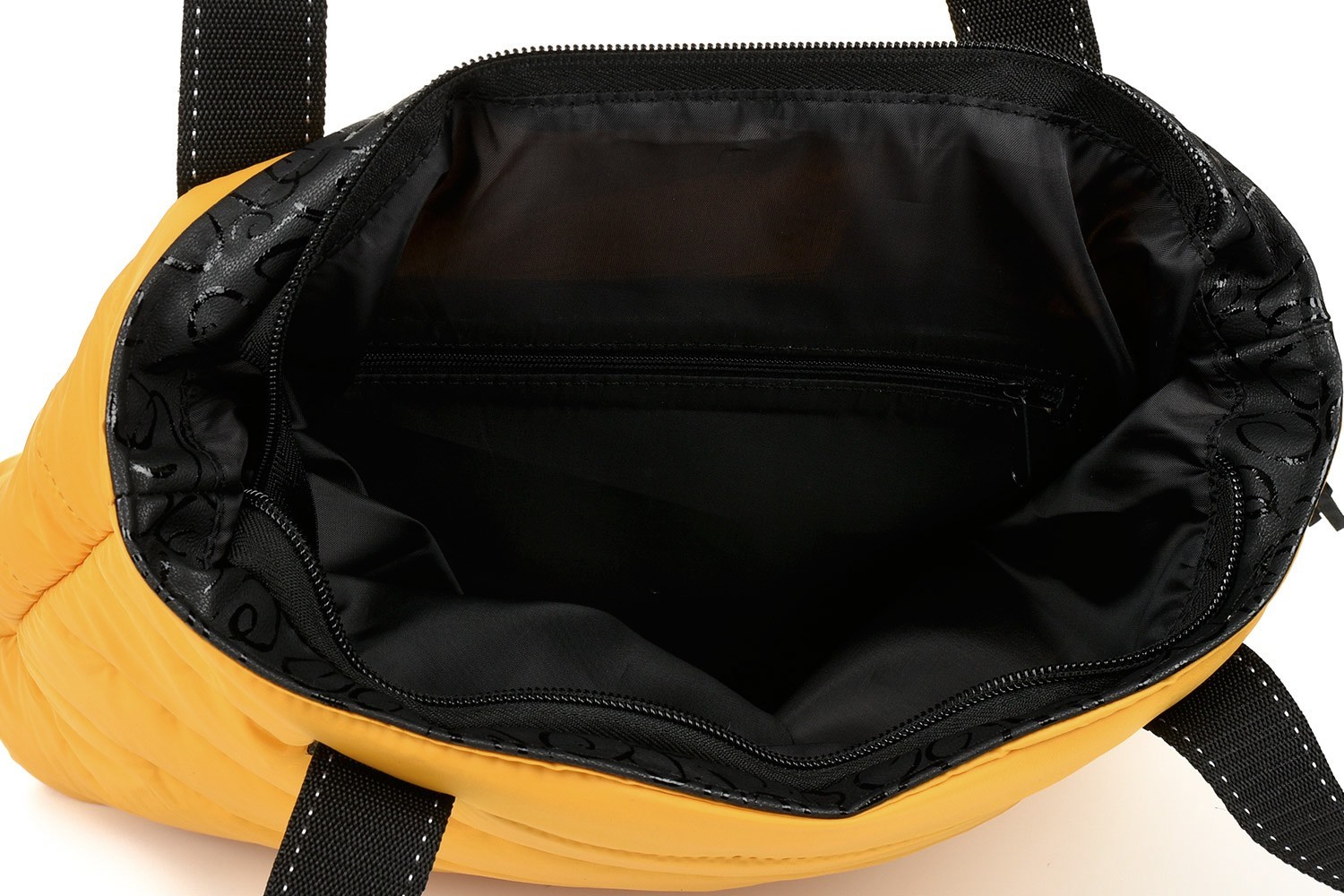 Dno torebki zostało usztywnione, wnętrze jest wyścielone podszewką, wewnątrz znajduje się dodatkowa kieszeń na suwak o wymiarach 16 cm x 20cm .