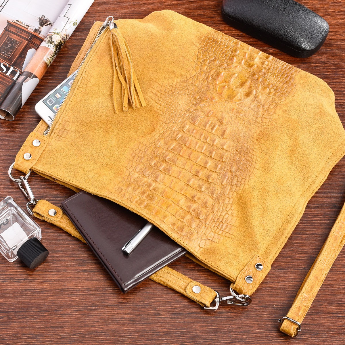- Wygląda niezwykle oryginalnie dzięki ciekawemu połączeniu zamszu z fakturą imitującą skórę krokodyla