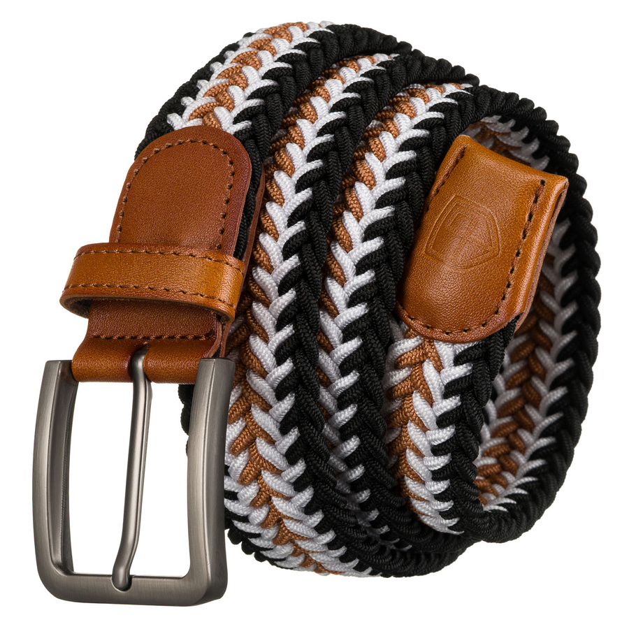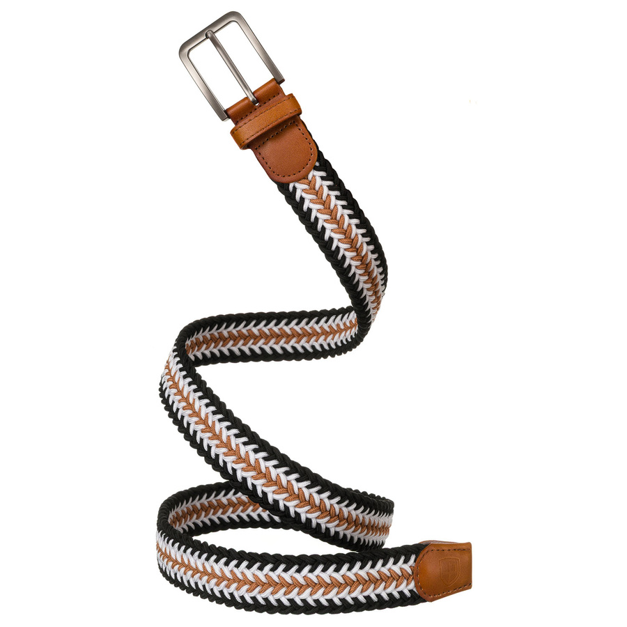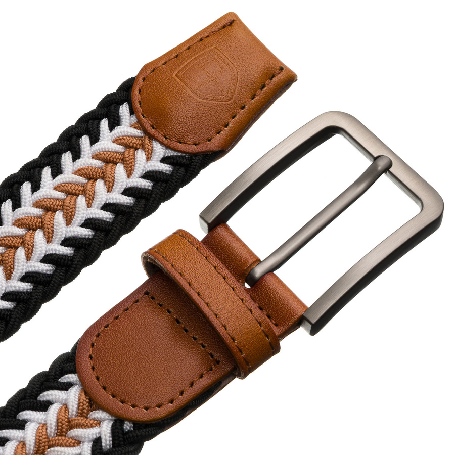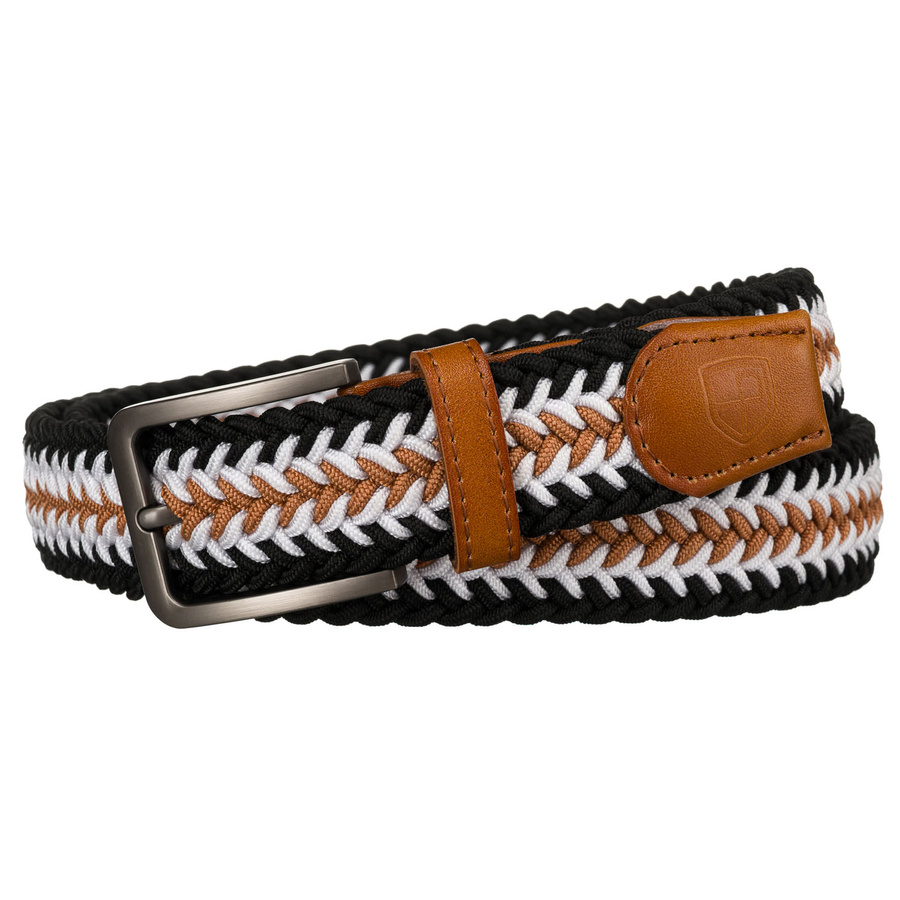 Pasek wyróżnia się efektownym, plecionym wzorem, który łączy trzy kolory: czarny, biały i brązowy.