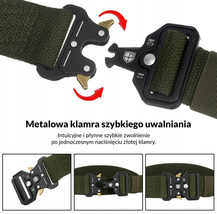 Metalowa klamra typu Quick Relase, umożliwia szybkie zapięcie lub odpięcie pasa w nagłych sytuacjach. Posiada specjalny system blokady uniemożliwiający przypadkowe odpięcie.
