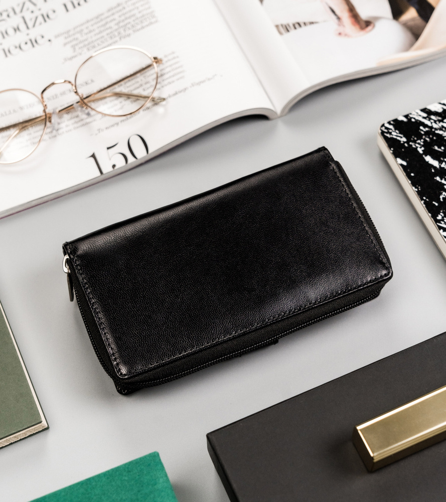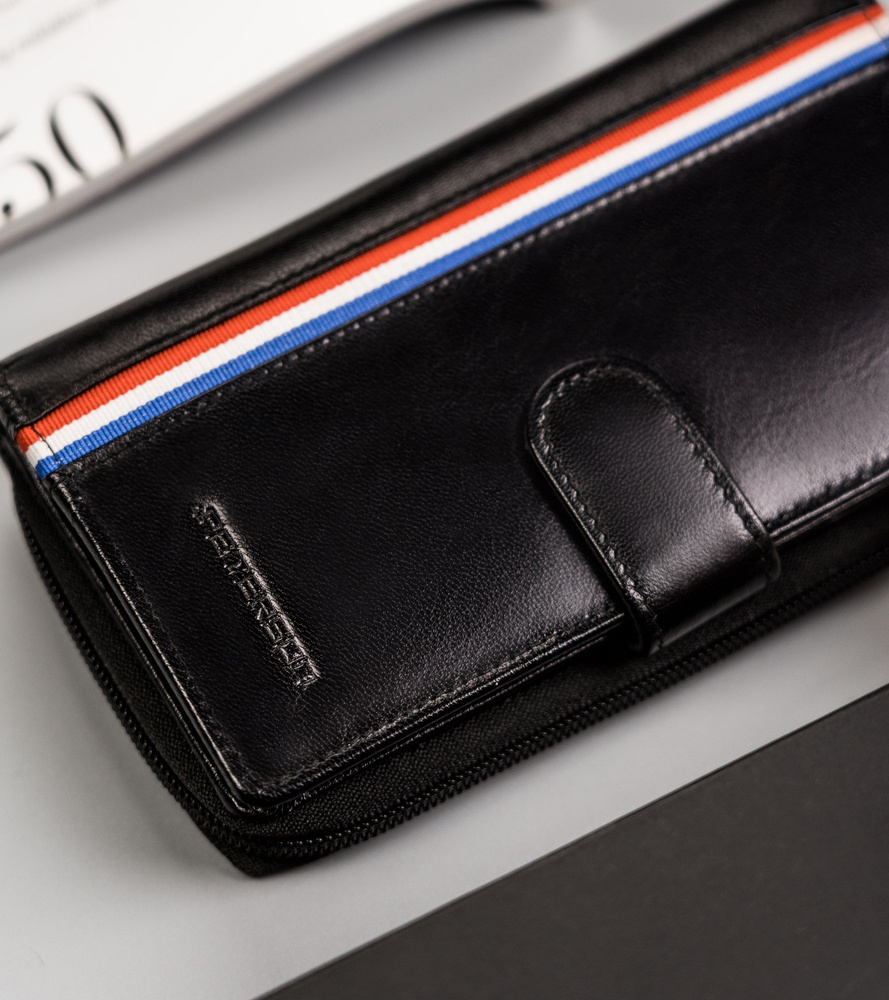 - Klasyczny czarny design | Portfel o klasycznej stylistyce w klasycznym czarnym kolorze. Model w orientacji pionowej, zapinany bezpiecznym i trwałym zatrzaskiem;