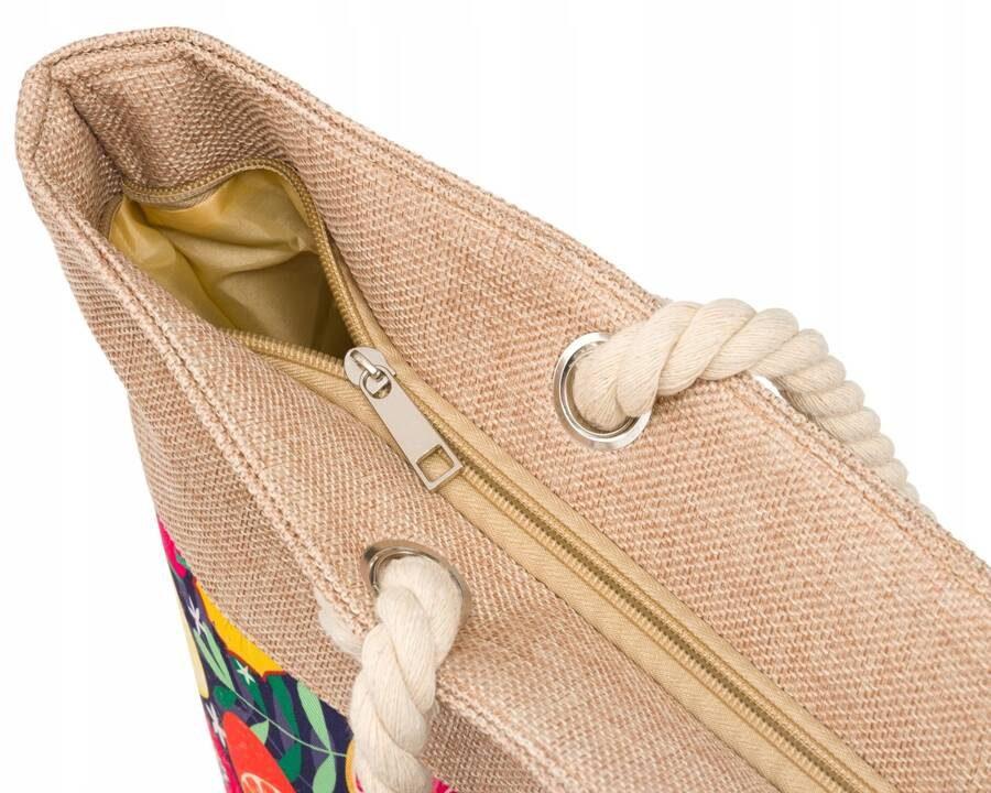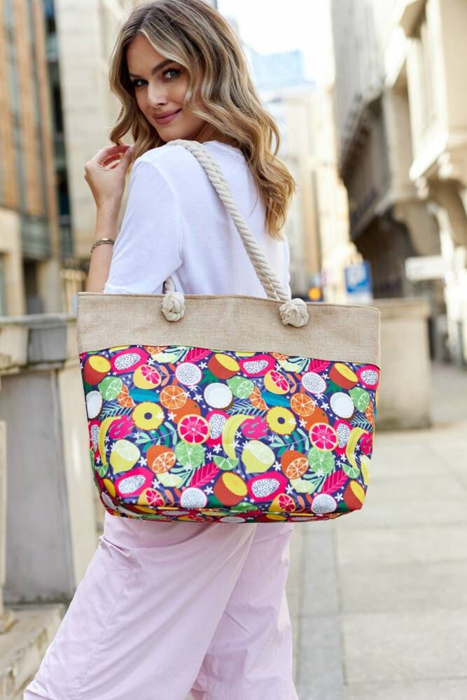 - Modna i funkcjonalna | Torebka zamykana od góry solidnym zamkiem błyskawicznym. Odszyta z wysokogatunkowego materiału, na którym widnieje piękny motyw w kolorowe owoce. Od góry uzupełniona jest parcianym materiałem w kolorze piaskowym;