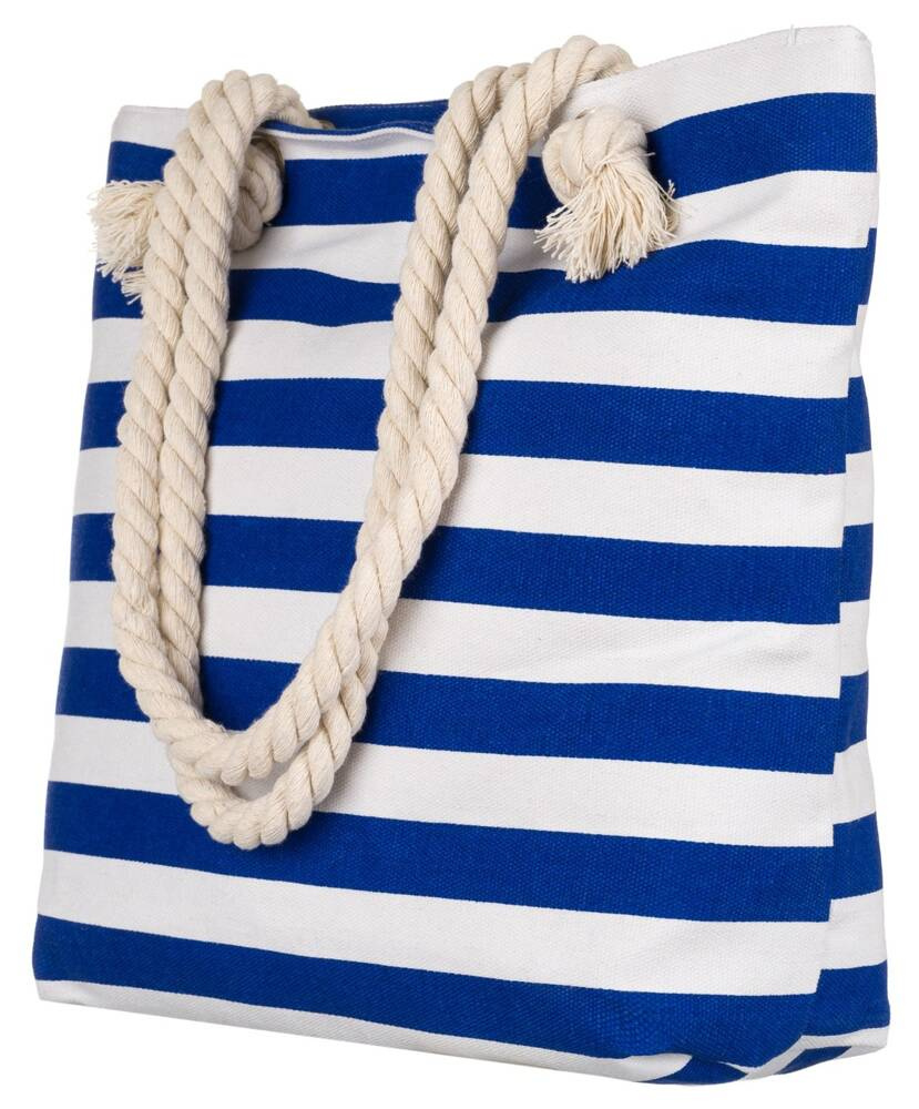- Zabierz ją na plażę! | Torebka zamykana od góry solidnym zamkiem błyskawicznym. Odszyta z wysokogatunkowego materiału, na którym widnieje motyw w marynarskie pasy;