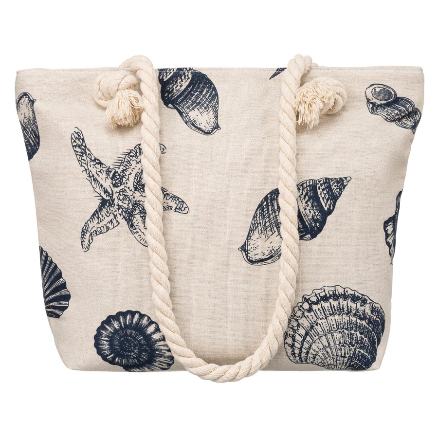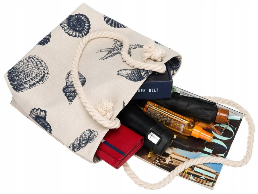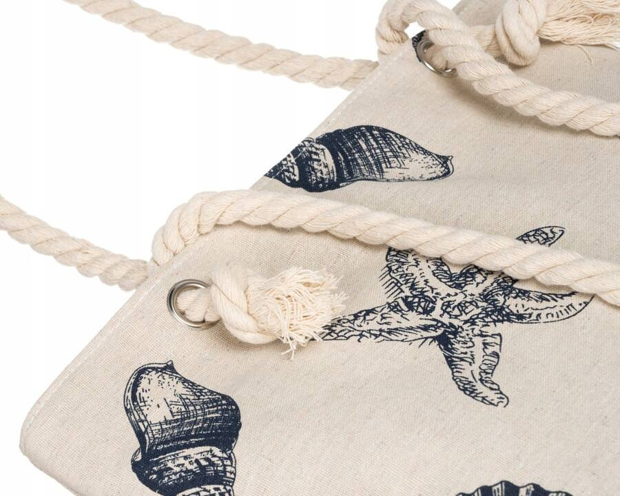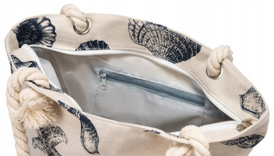 - Zabierz ją na plażę! | Torebka zamykana od góry solidnym zamkiem błyskawicznym. Odszyta z wysokogatunkowego materiału, na którym widnieje motyw w muszelki;