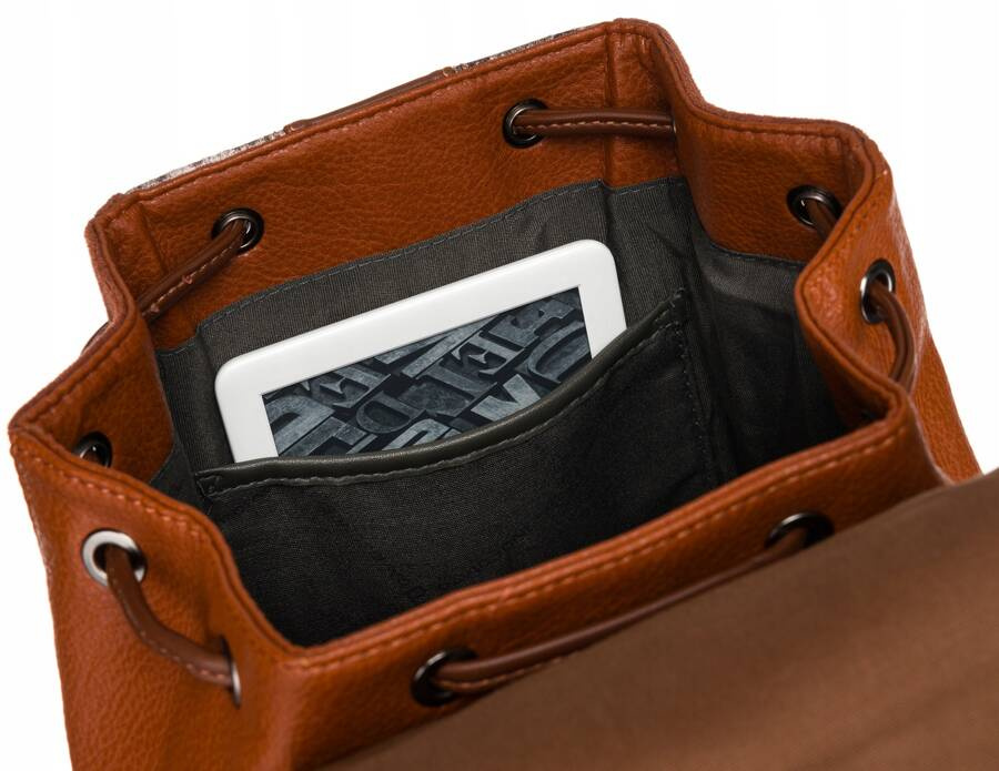 Plecak wyposażony jest w jedną przestronną komorę, która pomieści większe przedmioty, takie jak książka, notatnik (format A5), tablet czy portfel. Dodatkowo, trzy kieszenie, w tym jedna wewnętrzna zapinana na zamek, umożliwiają przechowywanie mniejszych rzeczy, takich jak klucze, telefon czy kosmetyki. Zapięcie na klamerkę i troczek zapewnia szybki dostęp do zawartości plecaka, jednocześnie chroniąc Twoje rzeczy.