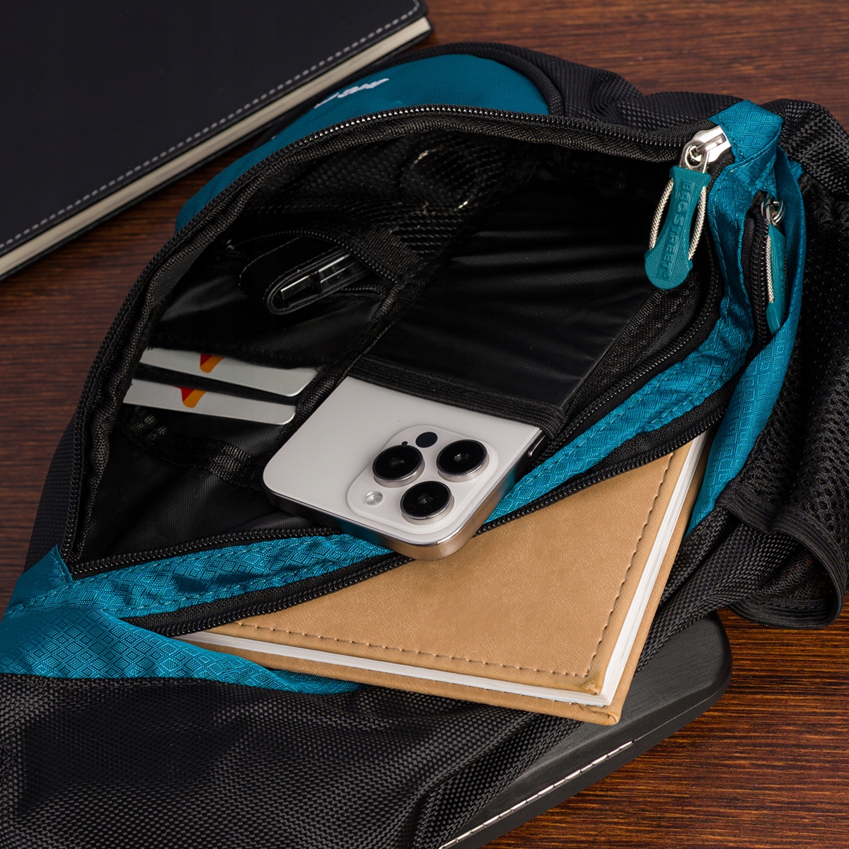 - Regulowana, szeroka szelka od wewnętrznej strony również posiada siateczkę przeciw poceniu się oraz piankę, która zmniejsza odczuwalność noszonego ciężaru; na zewnętrznej stronie szelki naszyto elastyczną kieszonkę na telefon