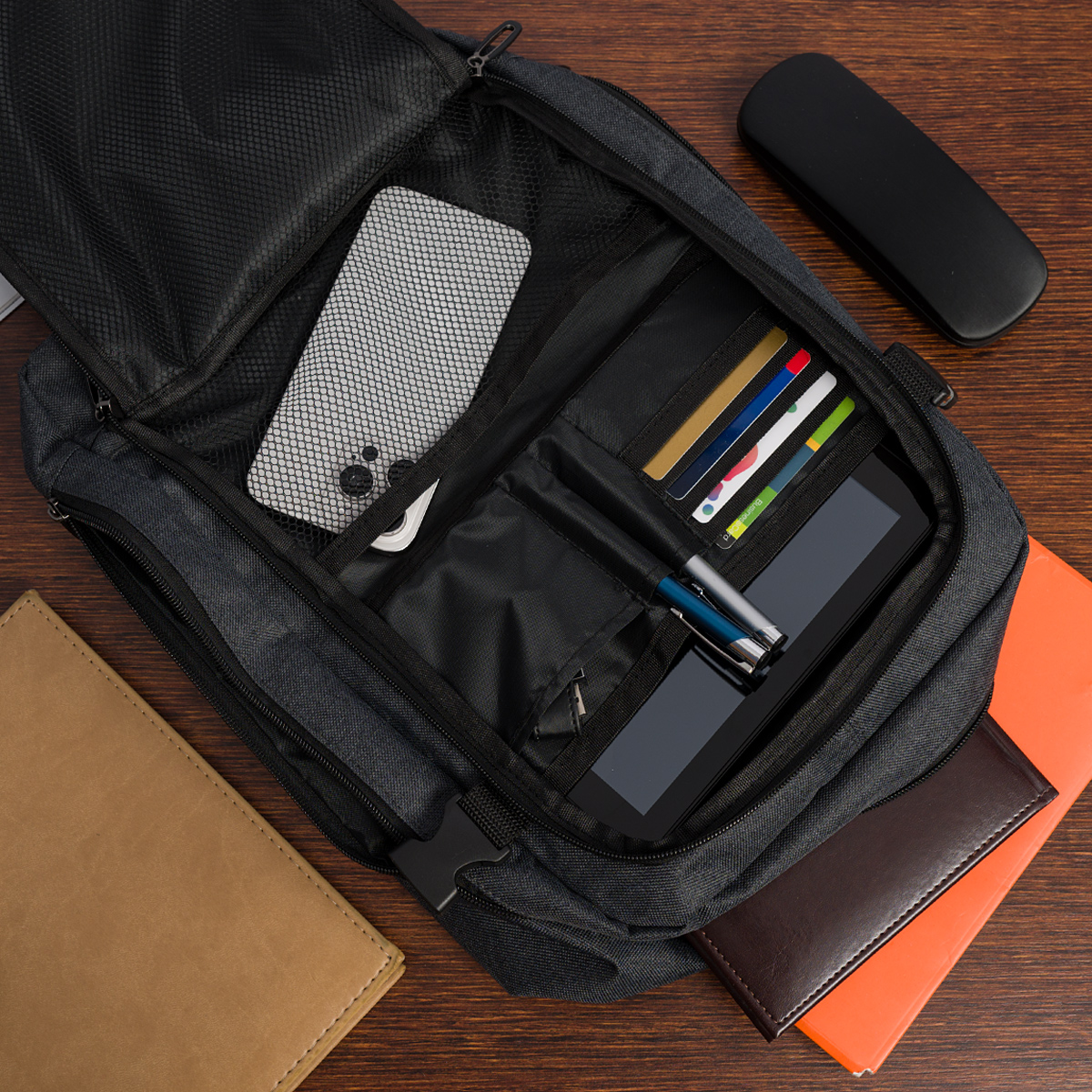 ? Druga komora: Aż 4 kieszenie (1 duża siateczkowa na suwak, 2 otwarte – w tym 1 siateczkowa, 1 mała otwarta), a także 2 miejsca na długopisy i 4 miejsca na karty płatnicze/dokumenty (np. dowód osobisty, prawo jazdy).