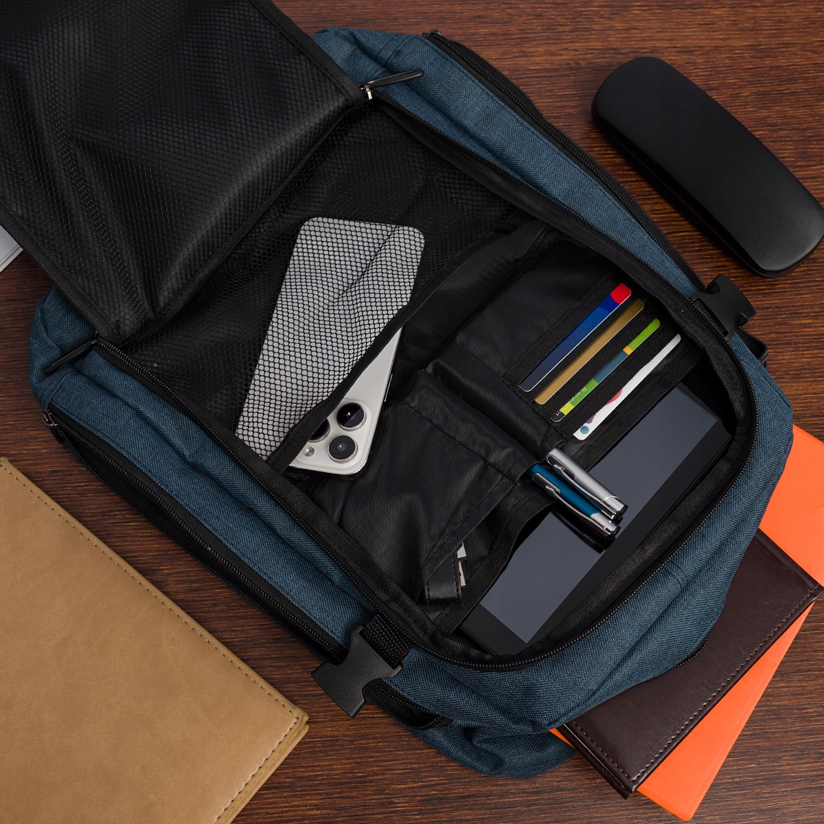 ? Druga komora: Aż 4 kieszenie (1 duża siateczkowa na suwak, 2 otwarte – w tym 1 siateczkowa, 1 mała otwarta), a także 2 miejsca na długopisy i 4 miejsca na karty płatnicze/dokumenty (np. dowód osobisty, prawo jazdy).
