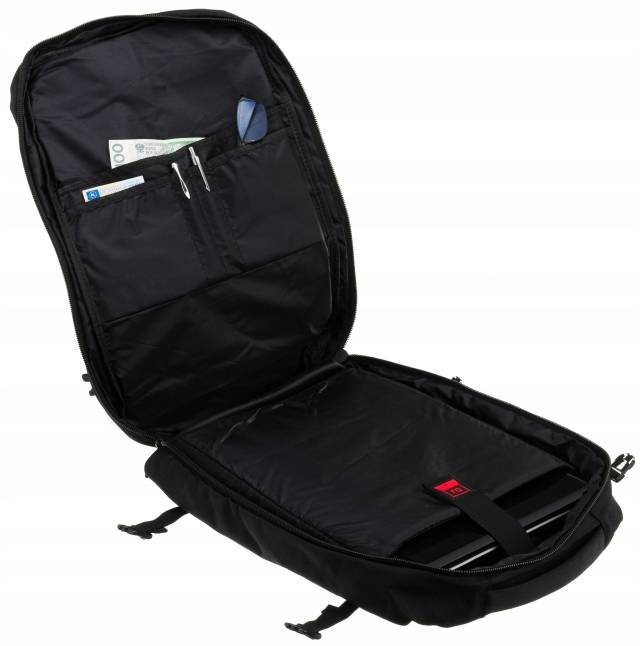Plecak jest niezwykle funkcjonalny, ma mnóstwo kieszeni i skrytek. Jest jednokomorowy, ogółem posiada 5 kieszonek. Jedna z nich dedykowana jest na laptopa 15″. Oprócz tego organizer, w którym znajdują się 2 przegrody na długopis. Wszystko to czyni plecak idealnym do pracy.