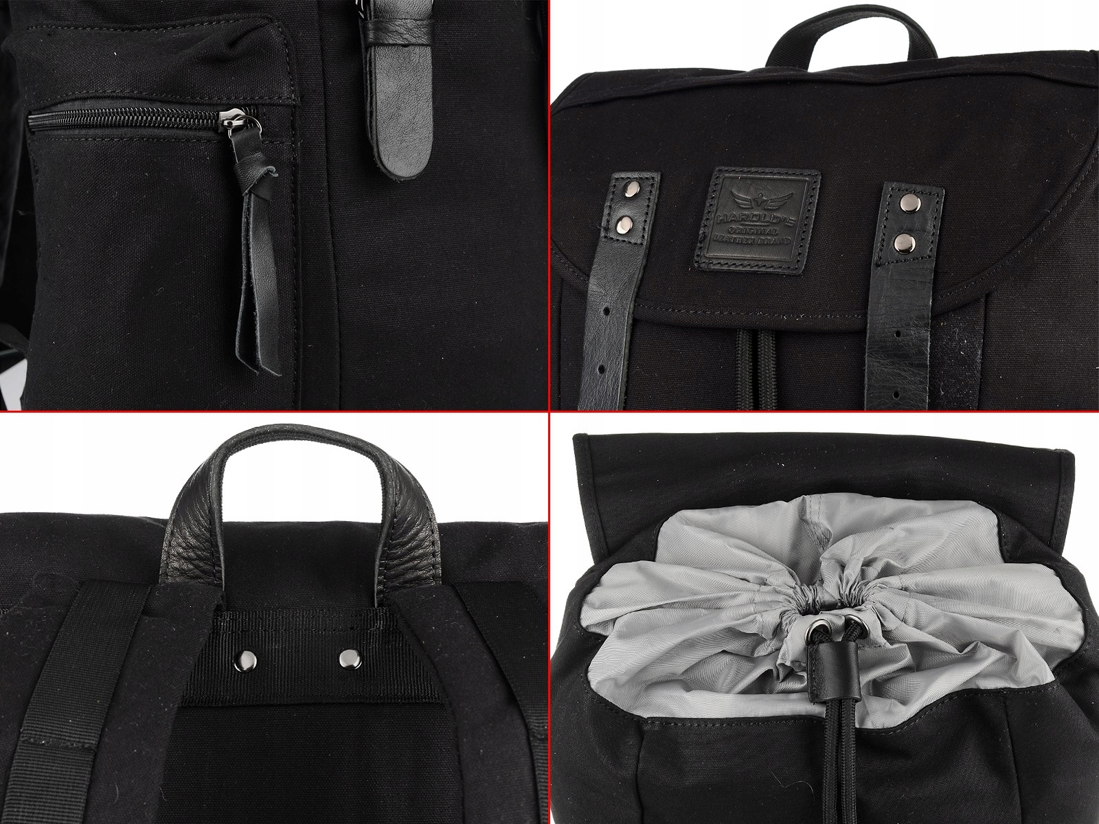 - Uchwyt: Plecak posiada skórzany uchwyt podszyty tkaniną, do przenoszenia lub zawieszenia na krześle bądź wieszaku;