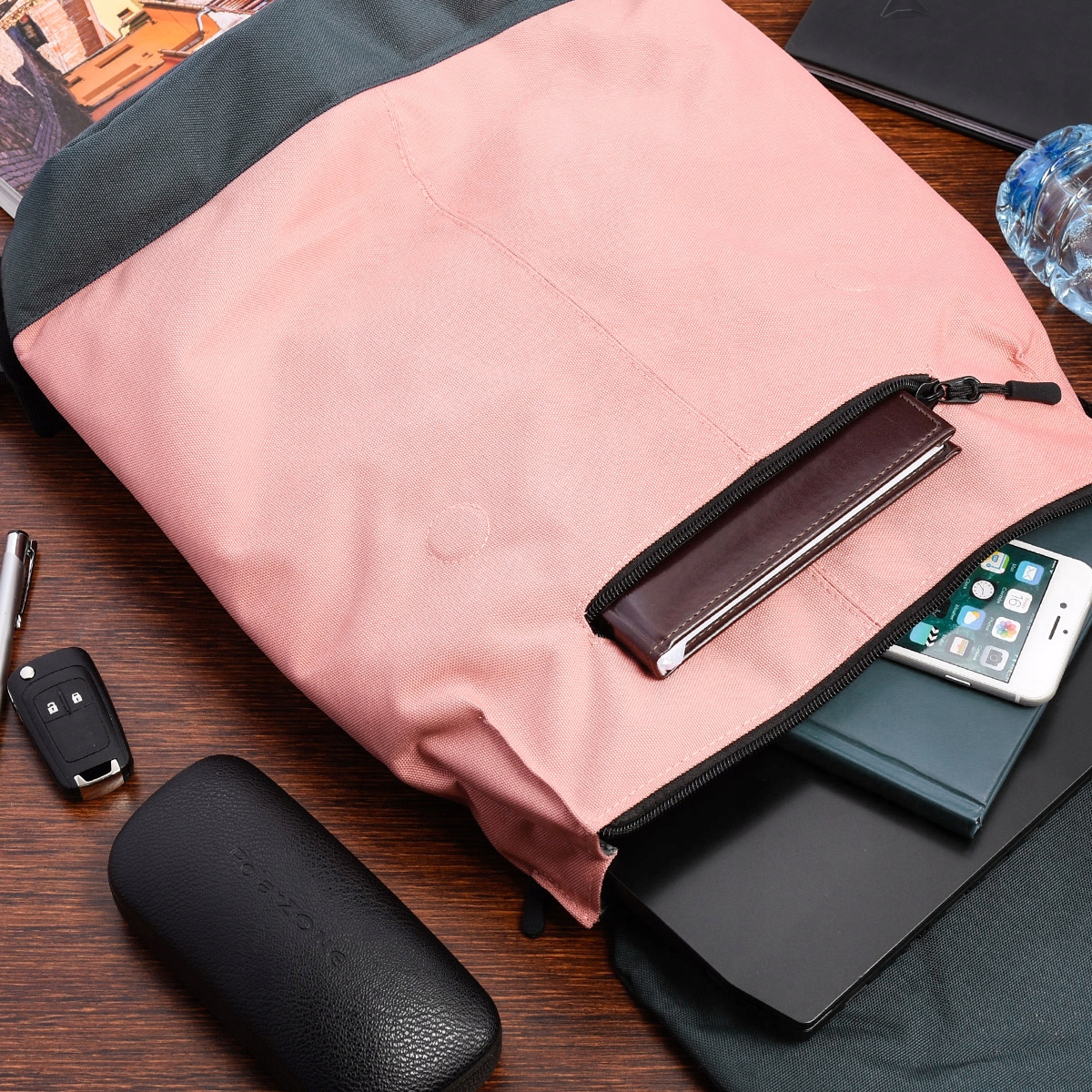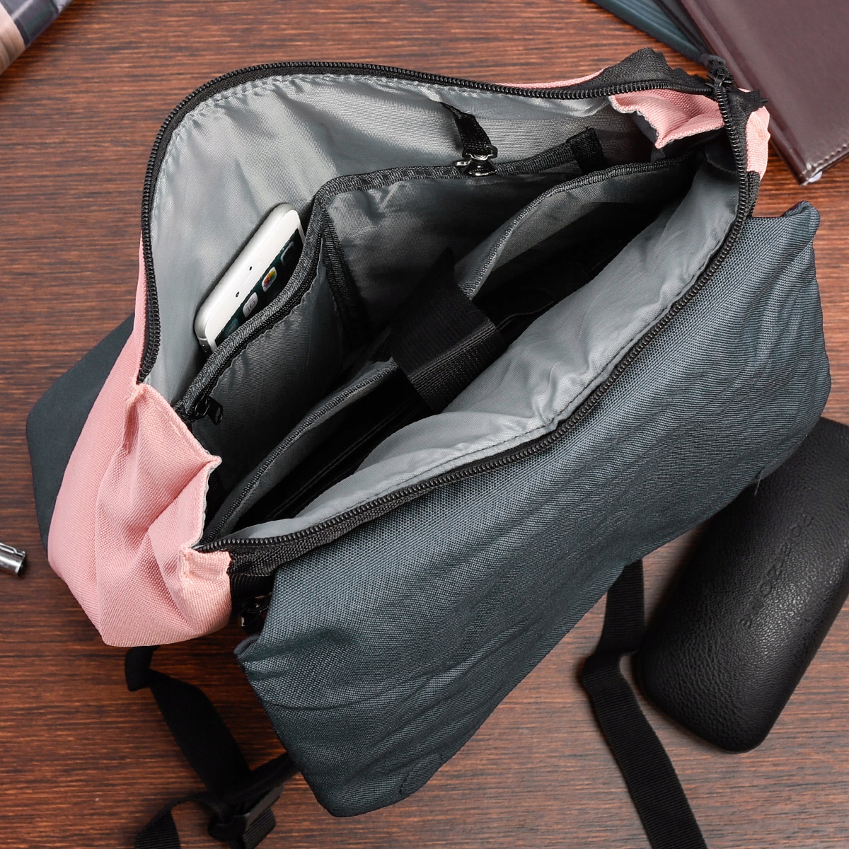 W środku znajdziesz 1 dużą kieszeń, zamykaną na suwak. Wewnątrz znajdują się: główna przegroda, dodatkowa przegroda zamykana na rzep oraz dwie małe kieszonki na telefon lub portfel. Na froncie plecaka jedna mała kieszonka zamykana na suwak.