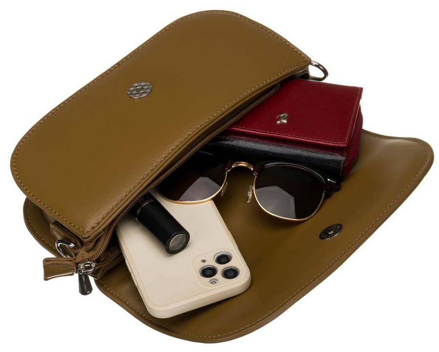 Mała torebka typu listonoszka zamykana stylową klapką na zamek magnetyczny. Tuż pod nią znajduje się jeszcze zamek błyskawiczny.