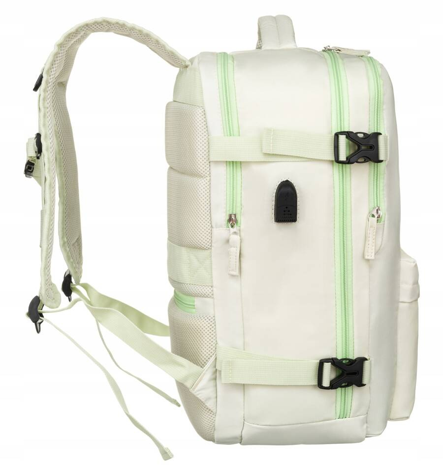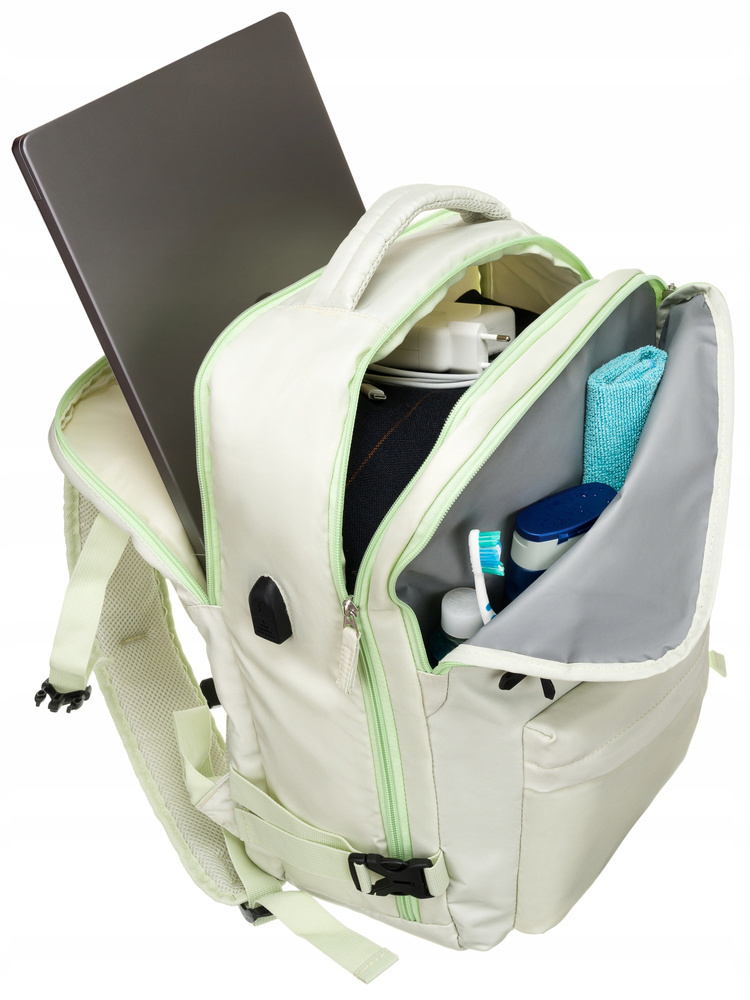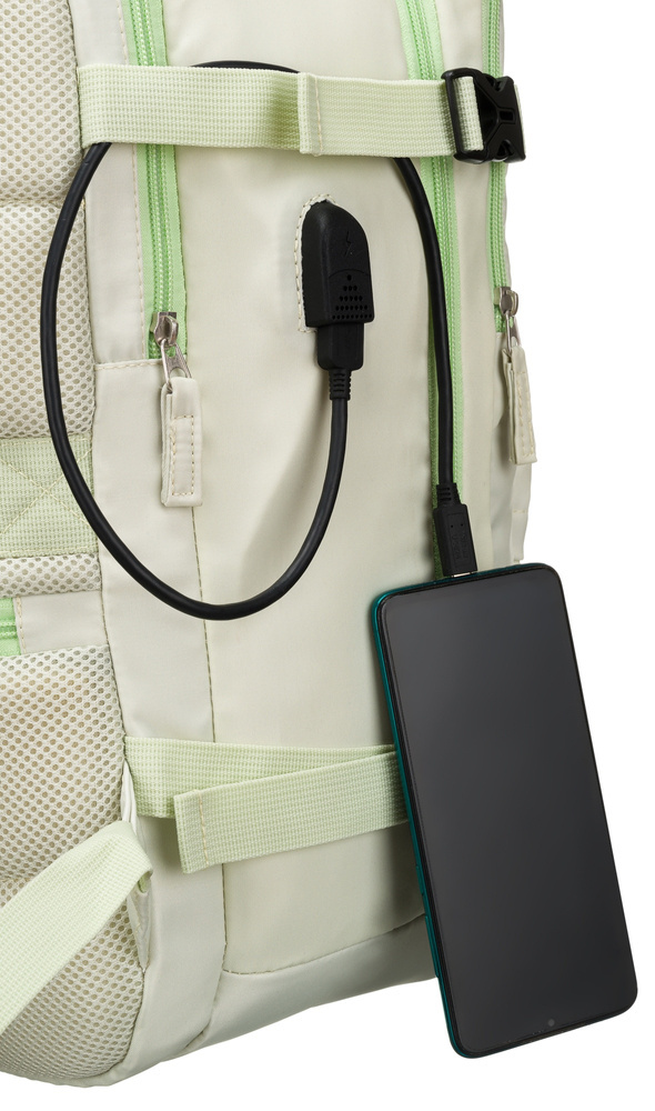 Plecak w swym wyposażeniu posiada również port USB, który służy jako „przejściówka”. Umożliwia to w wygodny sposób ładowanie Twojego laptopa, tabletu czy smartfona, bez wyjmowania go z plecaka.