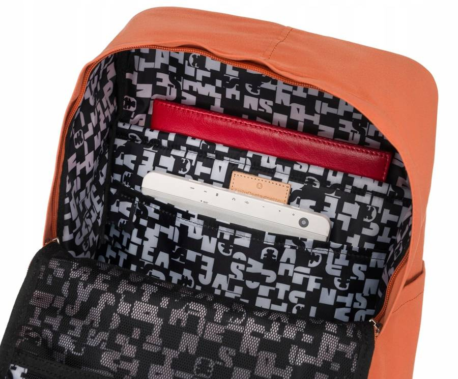 Plecak jednokomorowy zamykany solidnym zamkiem błyskawicznym. Wewnątrz komory umieszczona została 1 przegroda na urządzenie przenośne. Zmieści ona laptopa z przekątną ekranu do 14″.
