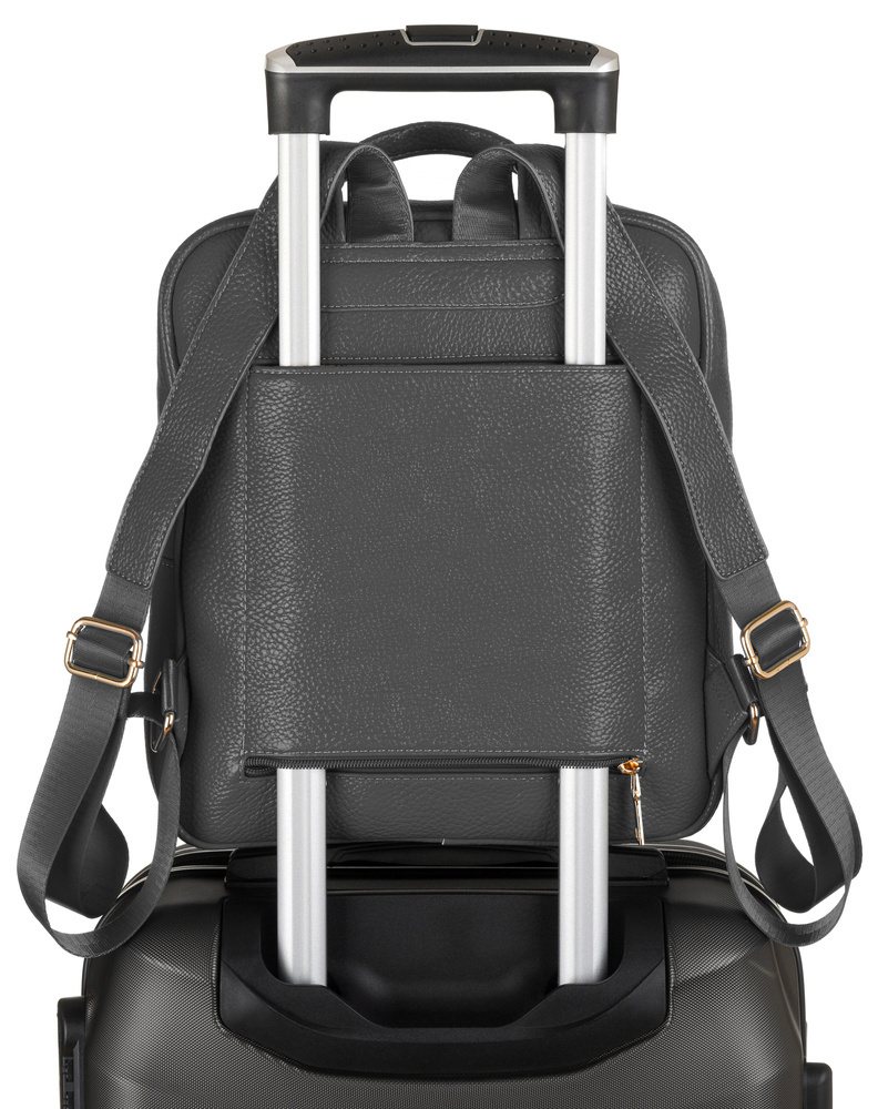 Tylna kieszeń ma dodatkową funkcję – po odsunięciu zamka zmienia się w uchwyt na walizkę.