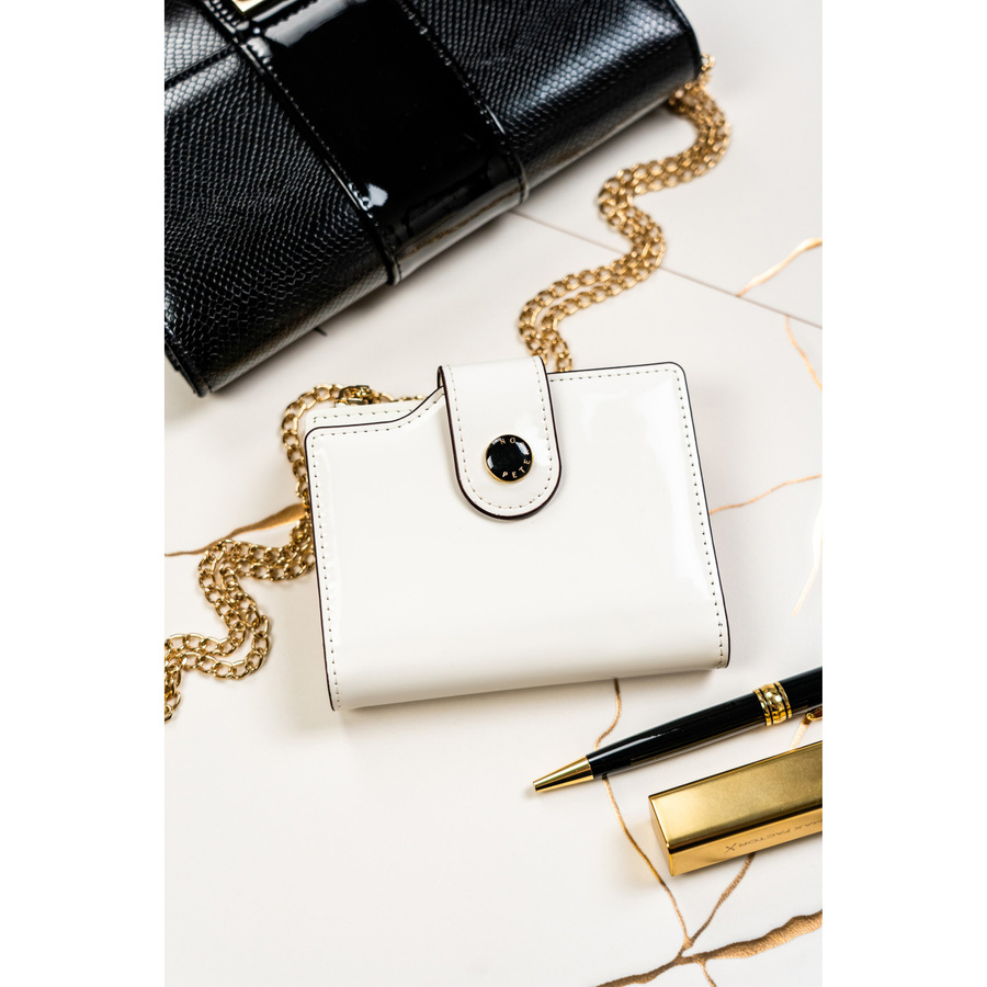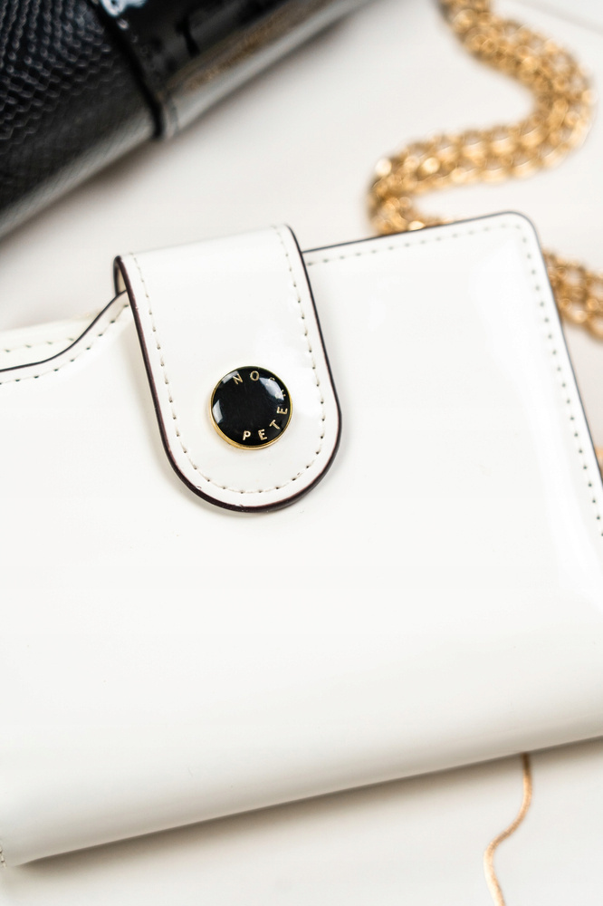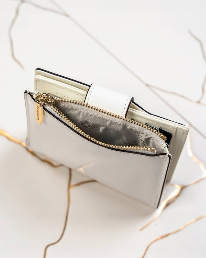 Pojemny, dwukomorowy portfel damski z zapięciem na zatrzask i suwak. Pierwsza jego część wyposażona jest w szereg praktycznych przegródek do przechowywania kart i dokumentów.