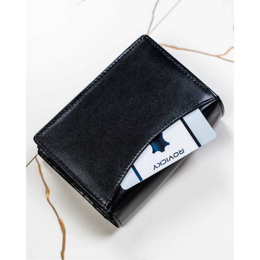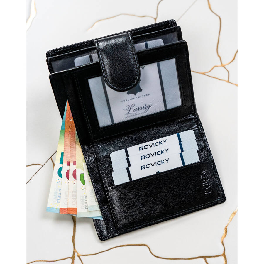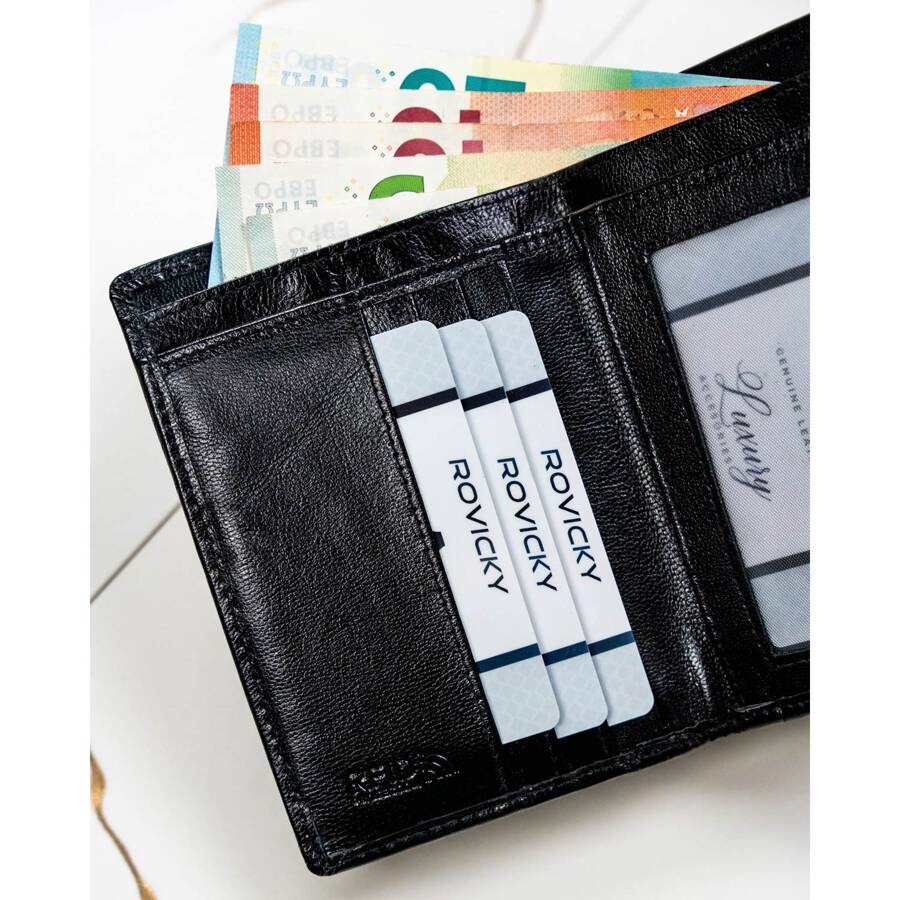 - 5 kieszonek na dokumenty w większym formacie, jak dowód rejestracyjny w okładce. Jedna z tych kieszeni umiejscowiona jest w tylnej, zewnętrznej części portfela. Możesz przechowywać tam rzeczy, które chcesz mieć na wyciągnięcie ręki, bez otwierania portfela.
