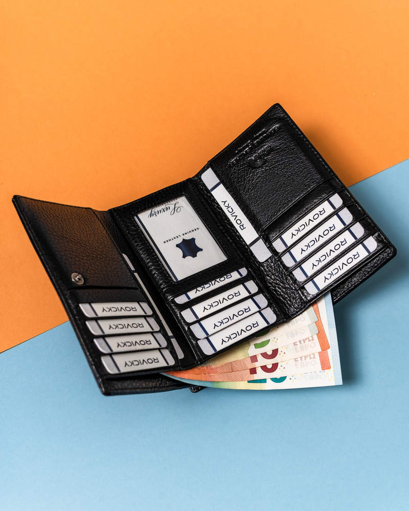 - Wyposażony w system RFID | Technologia ta zabezpiecza kartę w portfelu przed kradzieżą środków z konta;