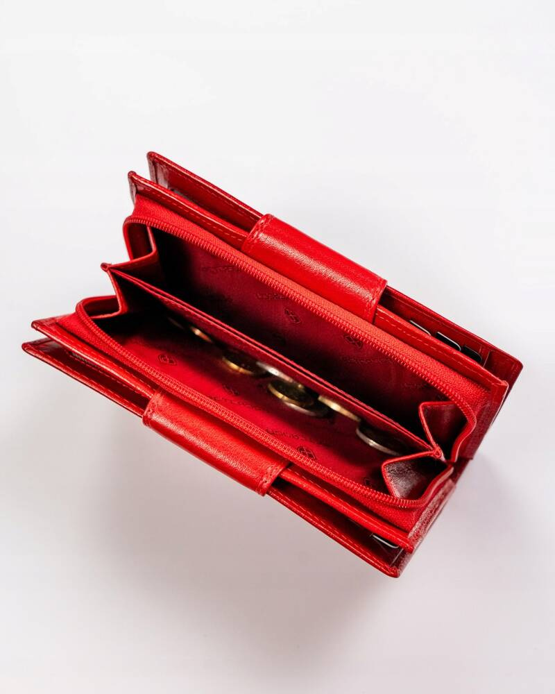 Portfel z bardzo rozbudowanym wnętrzem wyposażonym w wiele praktycznych przegródek.